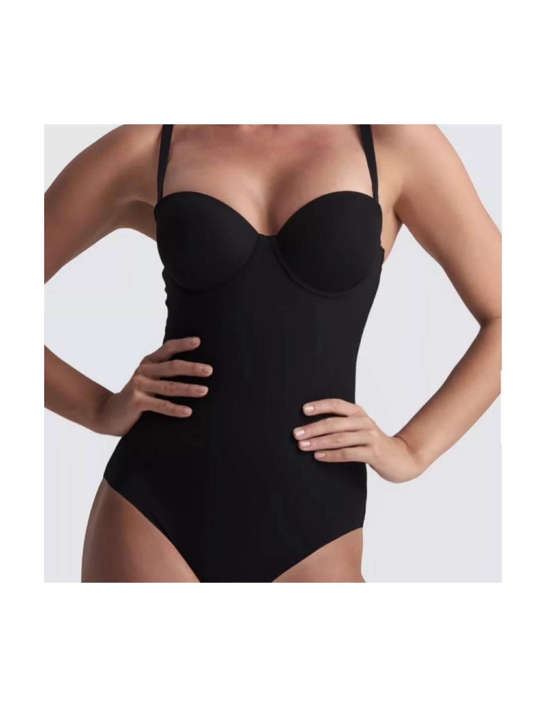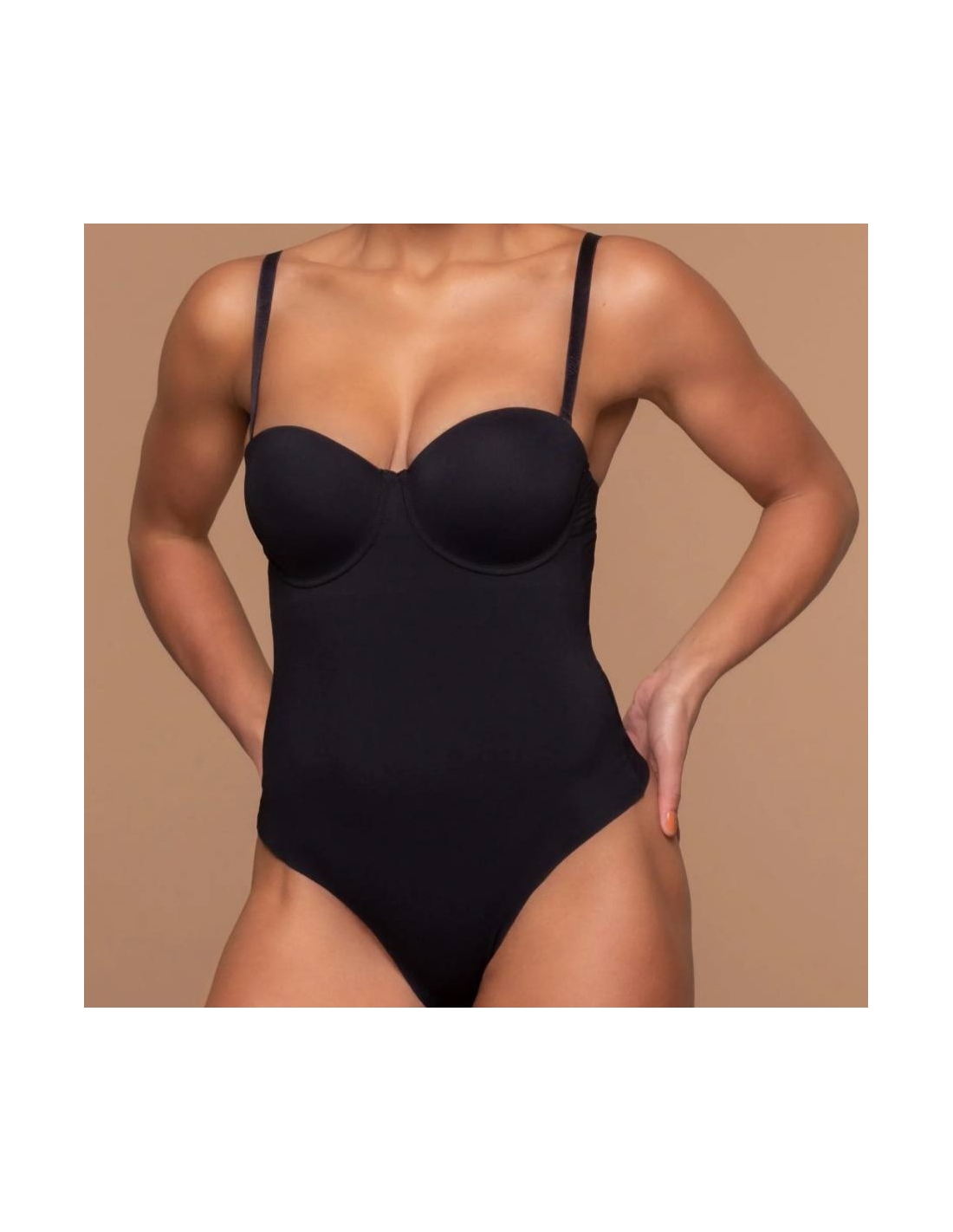 Body basic escote de corazón en tono negro. Efecto faja. Push up. Cierre en bajo. Con tirantas  extraíbles regulables a tono. Elástico.