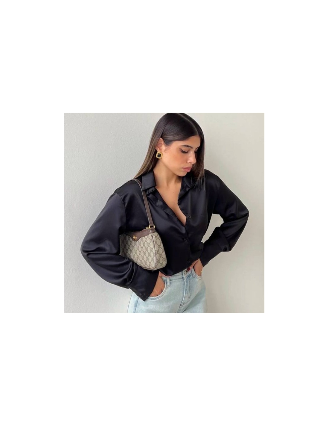 Camisa satén larga en tono negro. Cuello de solapa. Cierre delantero abotonado. De manga larga. Talla única