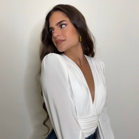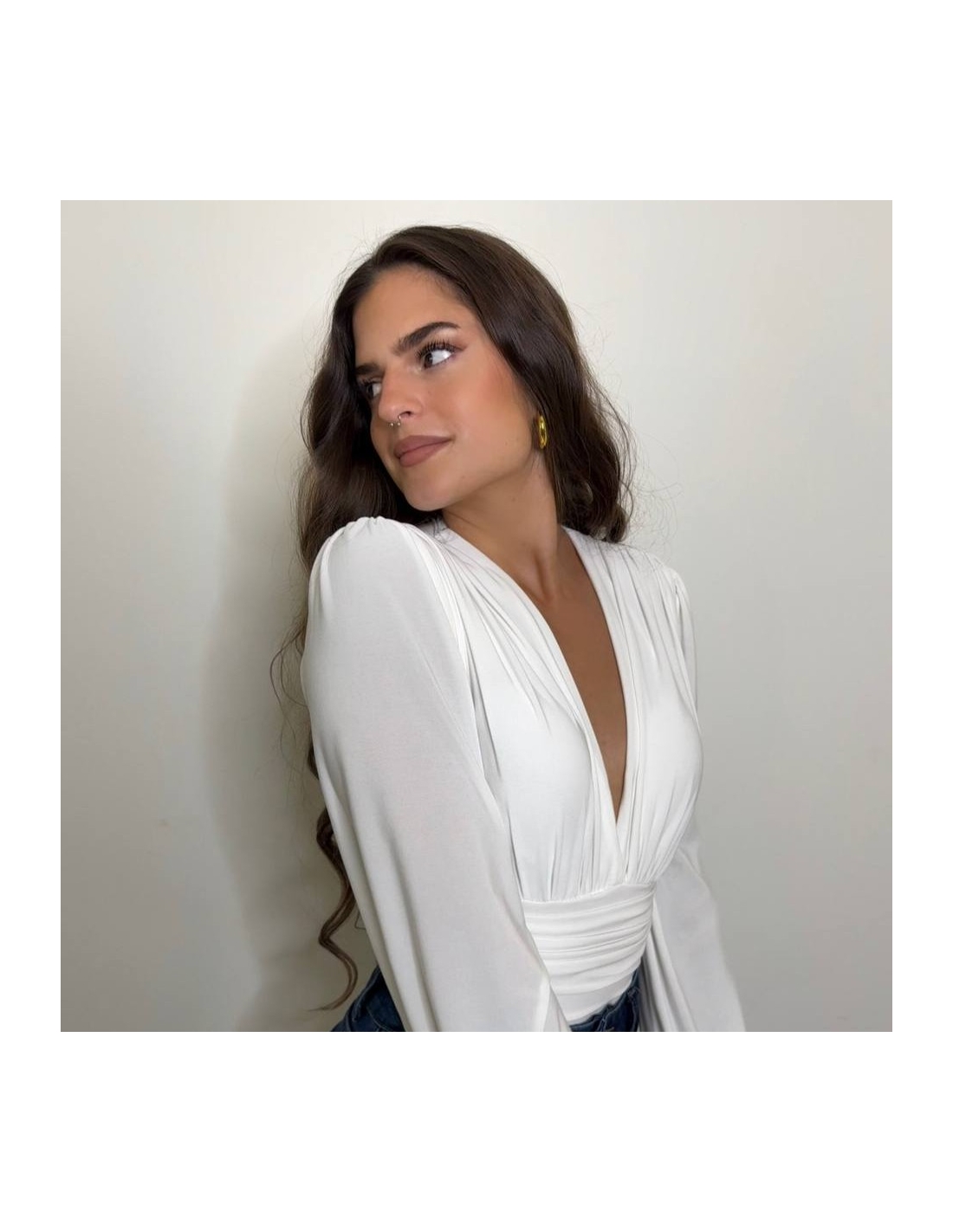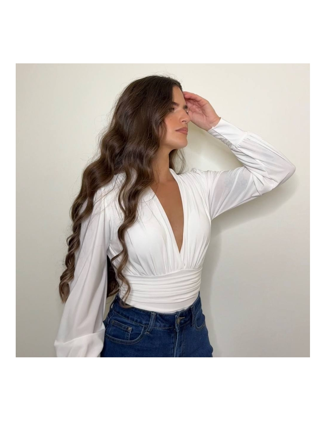 Body escote V blanco. De manga larga. Cierre en bajo. De manga larga fluido. Talla única
