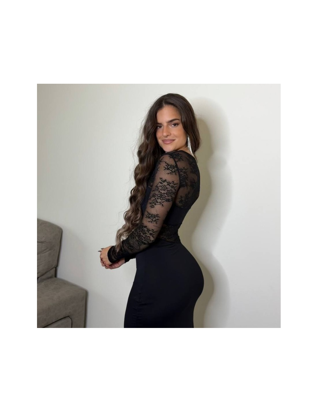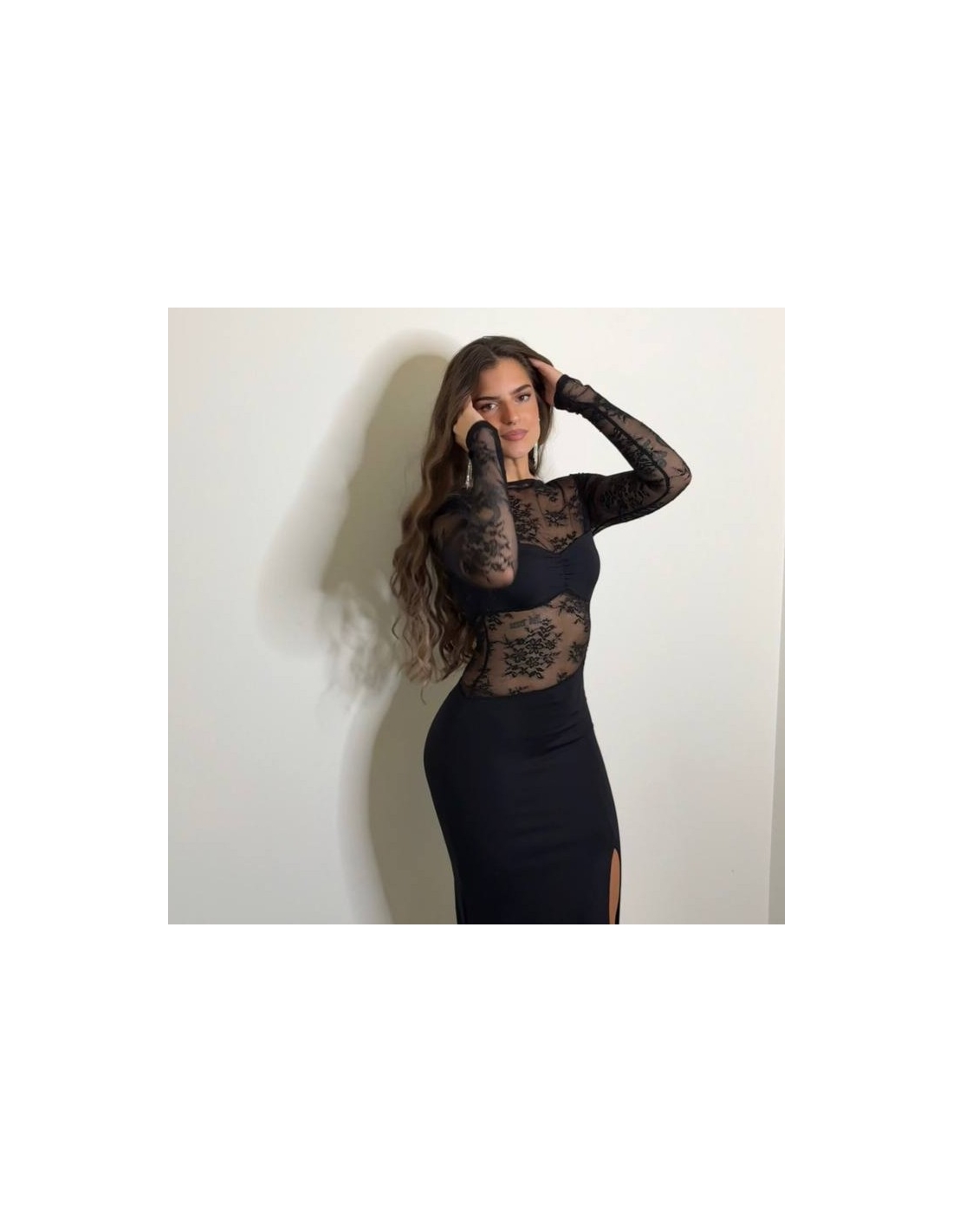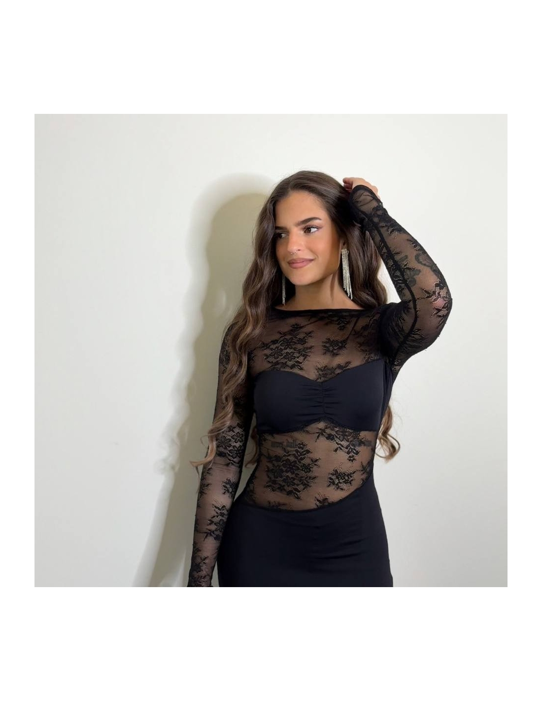 Vestido negro ajustado en tono negro. Banda en zona del pecho a tono. Transparencias con encaje en parte superior. De manga larga. Talla única