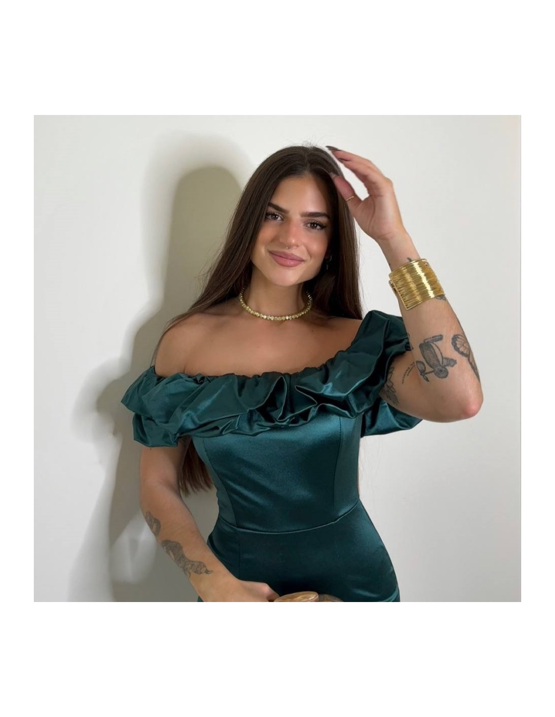 Vestido satén corto en tono verde esmeralda. Volante en escote. Cierre trasero con cremallera oculta. Ideal para talla XS-S. Talla única