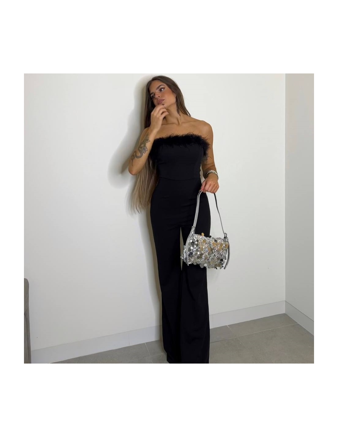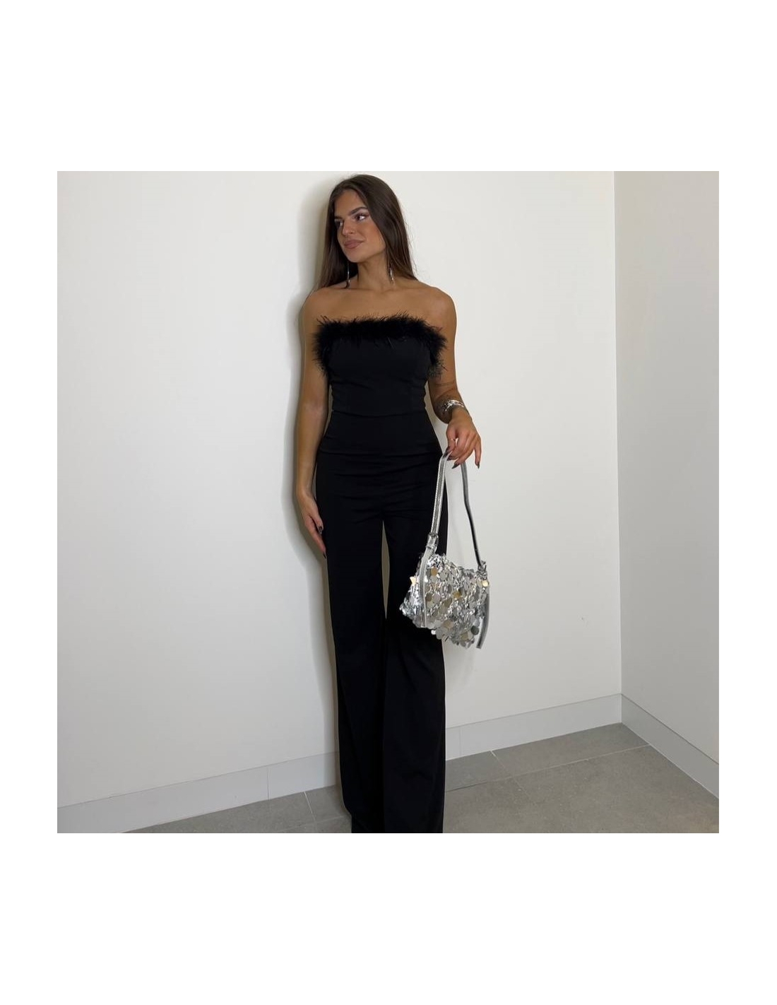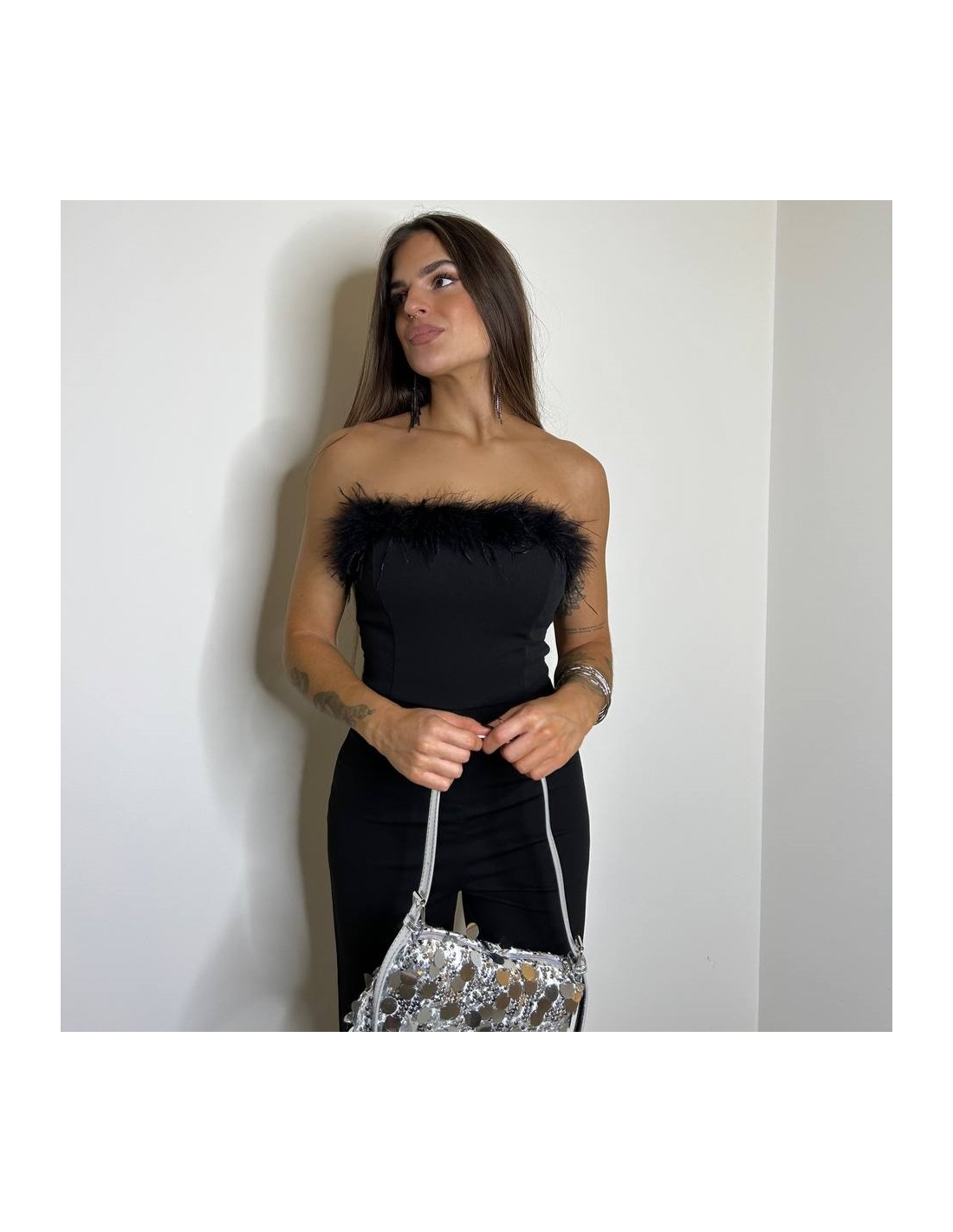 Mono largo de plumas en escote. Tiranta fina regulable opcional a tono. Cierre trasero con cremallera oculta. Talla única.