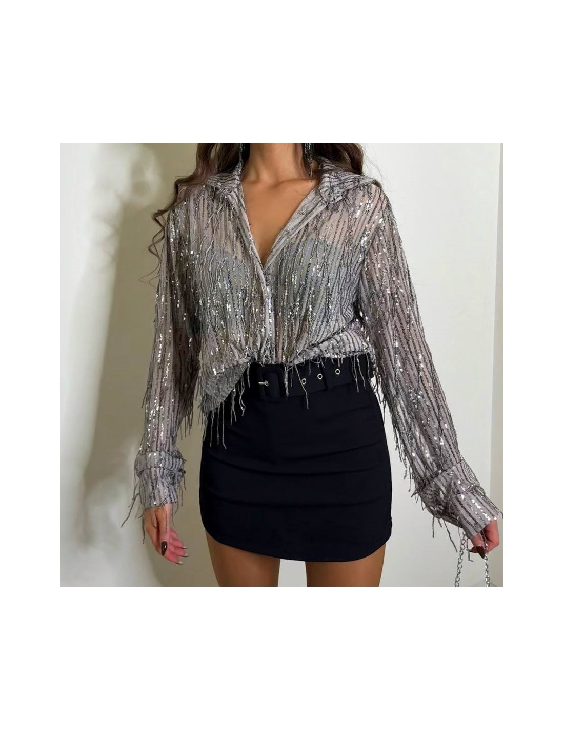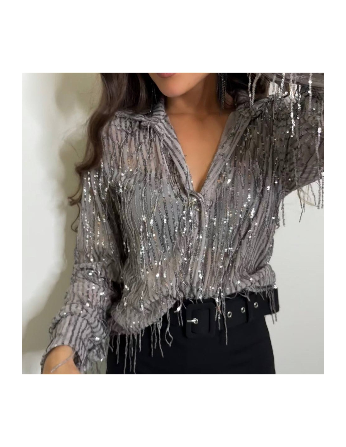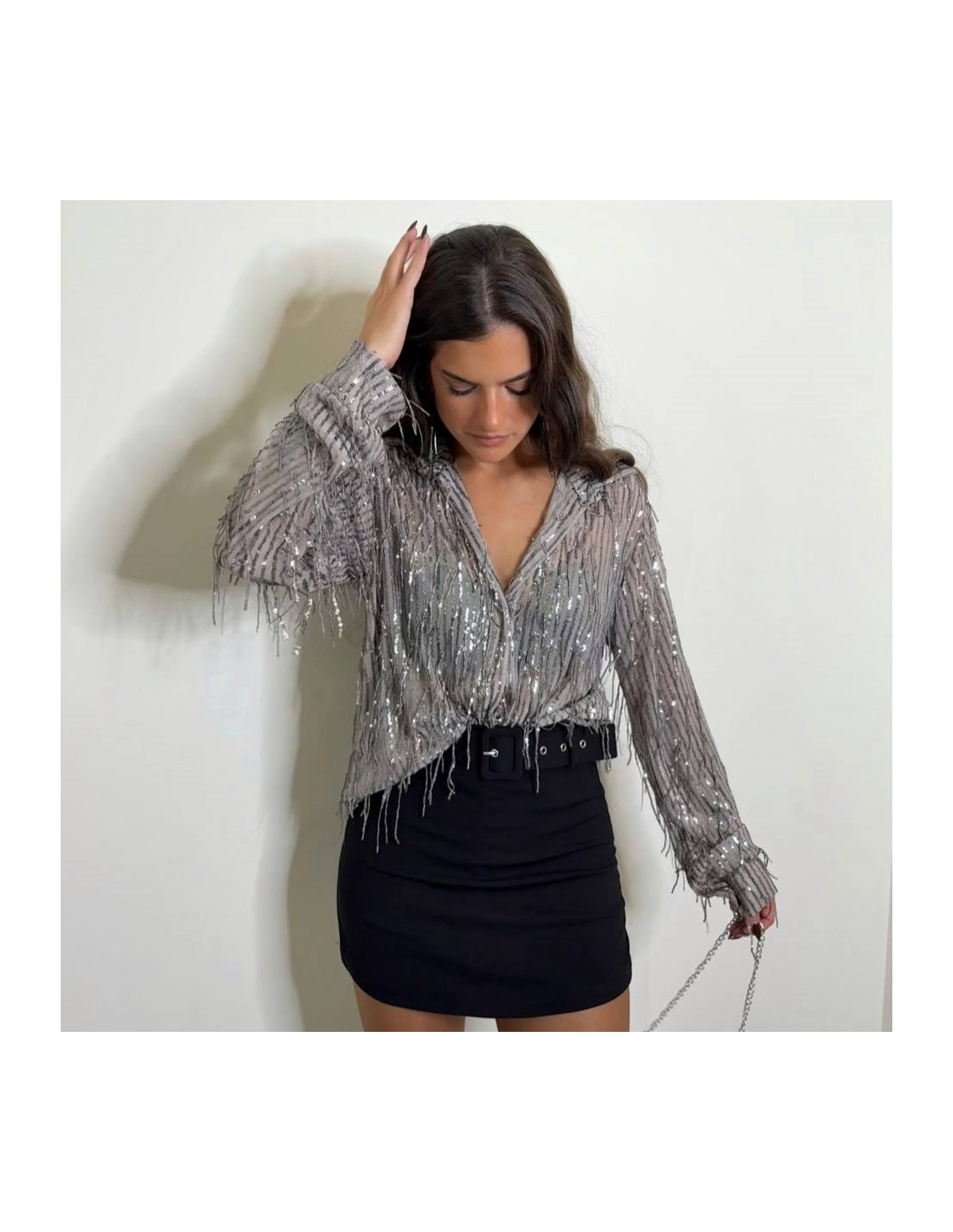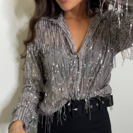 Camisa flecos lentejuela en tono gris. De manga larga. Cierre delantero abotonado. Cuello de solapa. Talla única