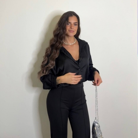 Camisa satén larga en tono negro. Cuello de solapa. Cierre delantero abotonado. De manga larga. Talla única