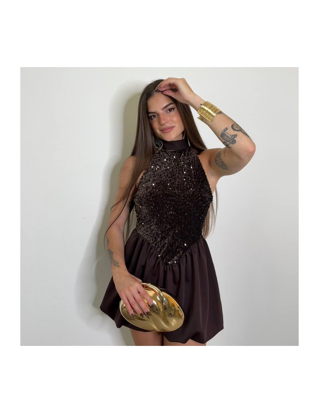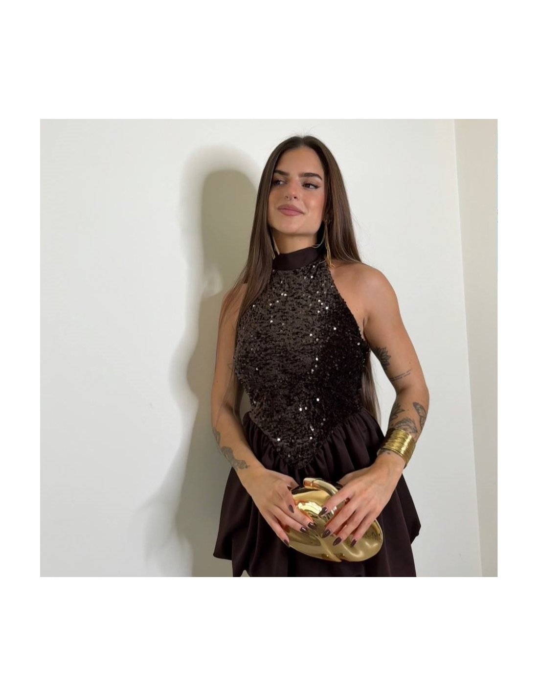 Vestido globo halter lentejuelas. Escote en espalda y regulable con lazada. Con forro interior a tono. Lentejuela flexible. Talla única