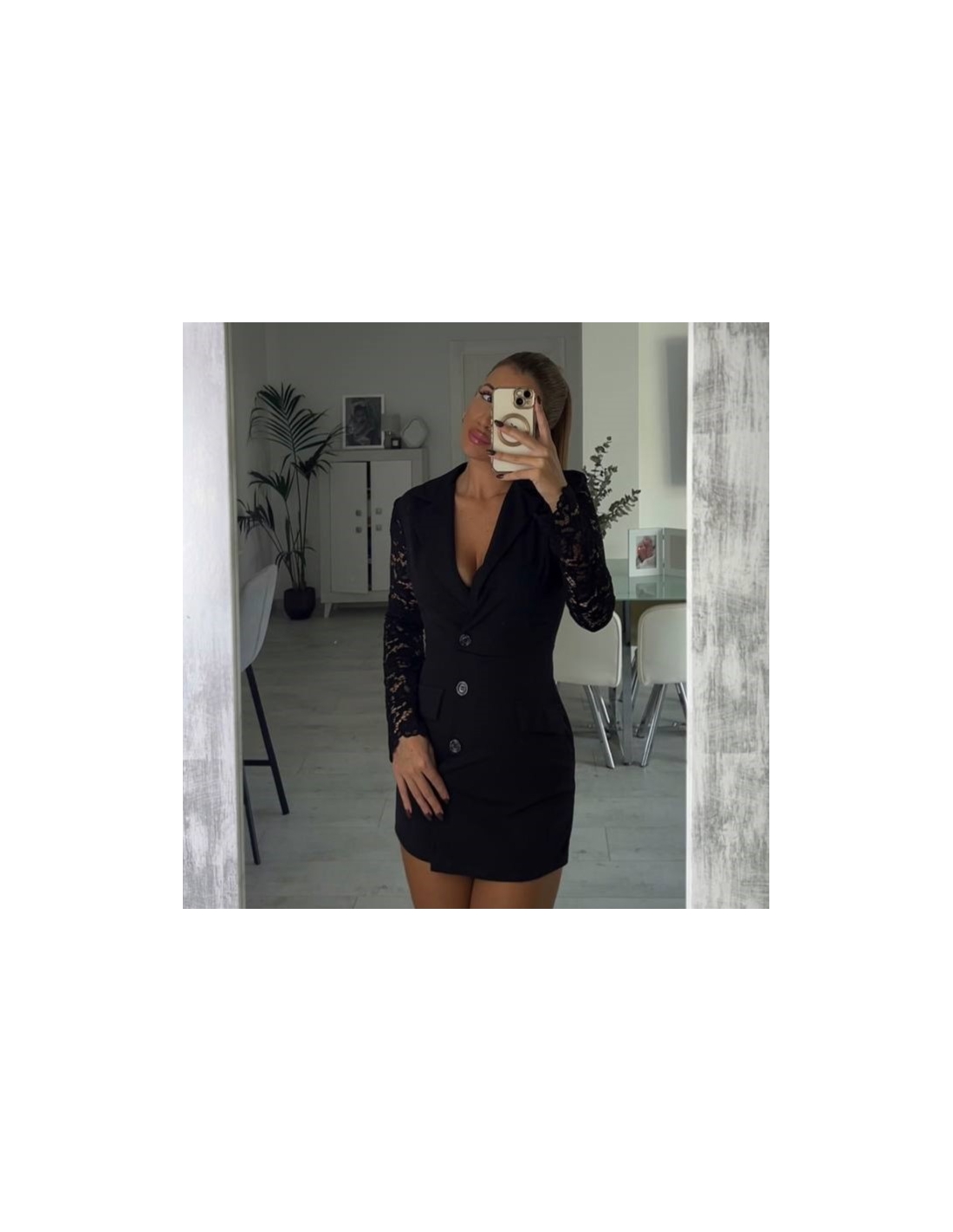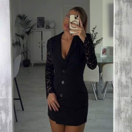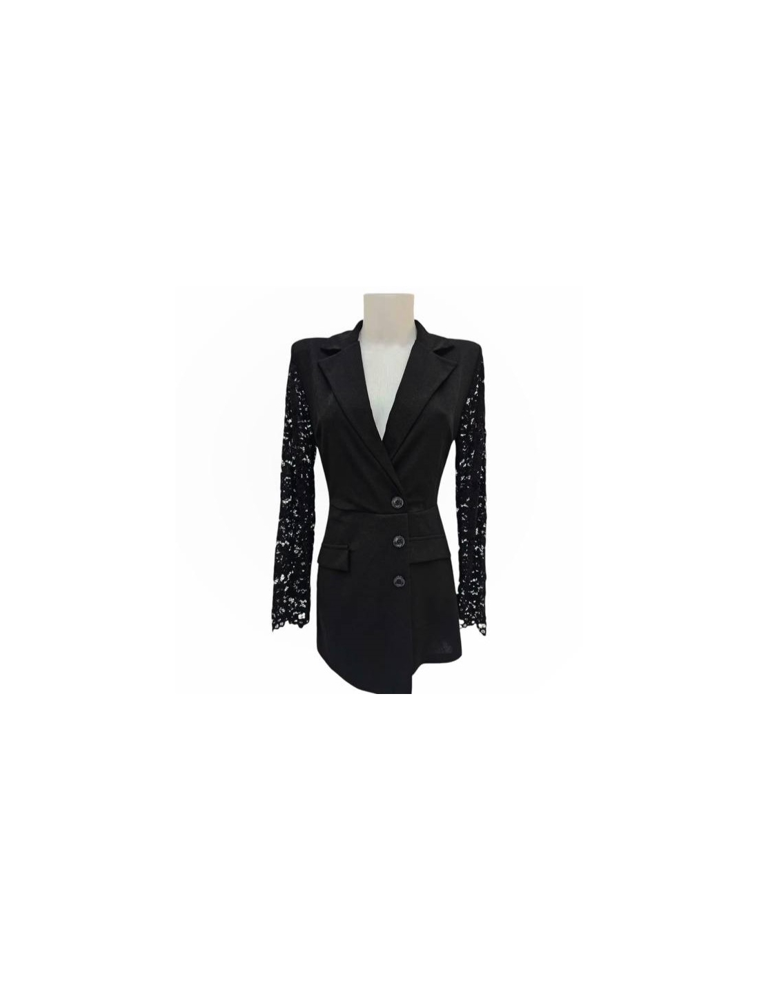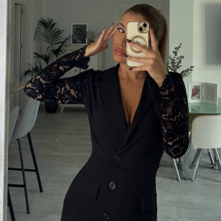 Mono corto en tono negro con mangas encaje. Cierre delantero abotonado. Cierre delantero abotonado. Cuello de solapa. Talla única