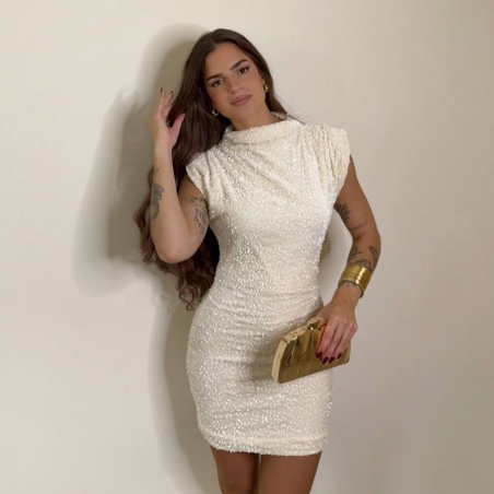 Vestido corto de lentejuelas en tono blanco. Con hombreras. Forro interior a tono. Talla única