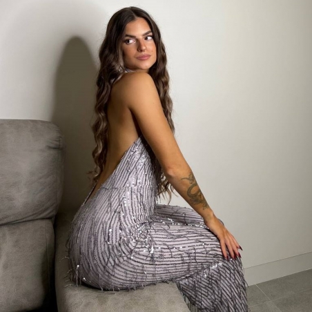 Mono flecos largo de lentejuelas. De campana. Regulable con lazada al cuello. Con forro a tono. Talla única