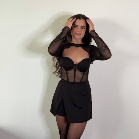 Mono corto en tono negro. Transparencias en parte superior. Abertura en escote. Con casco incorporados. Talla única