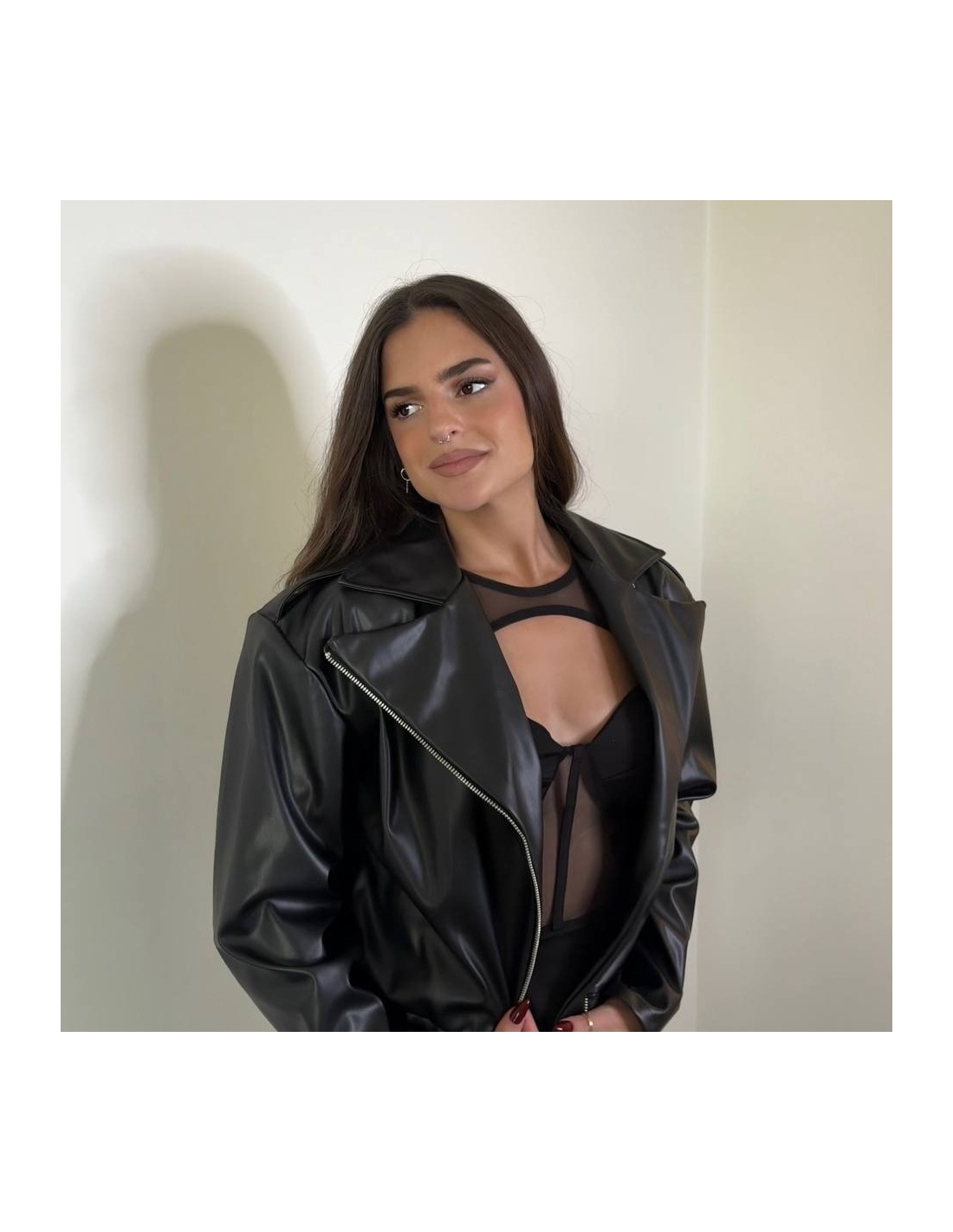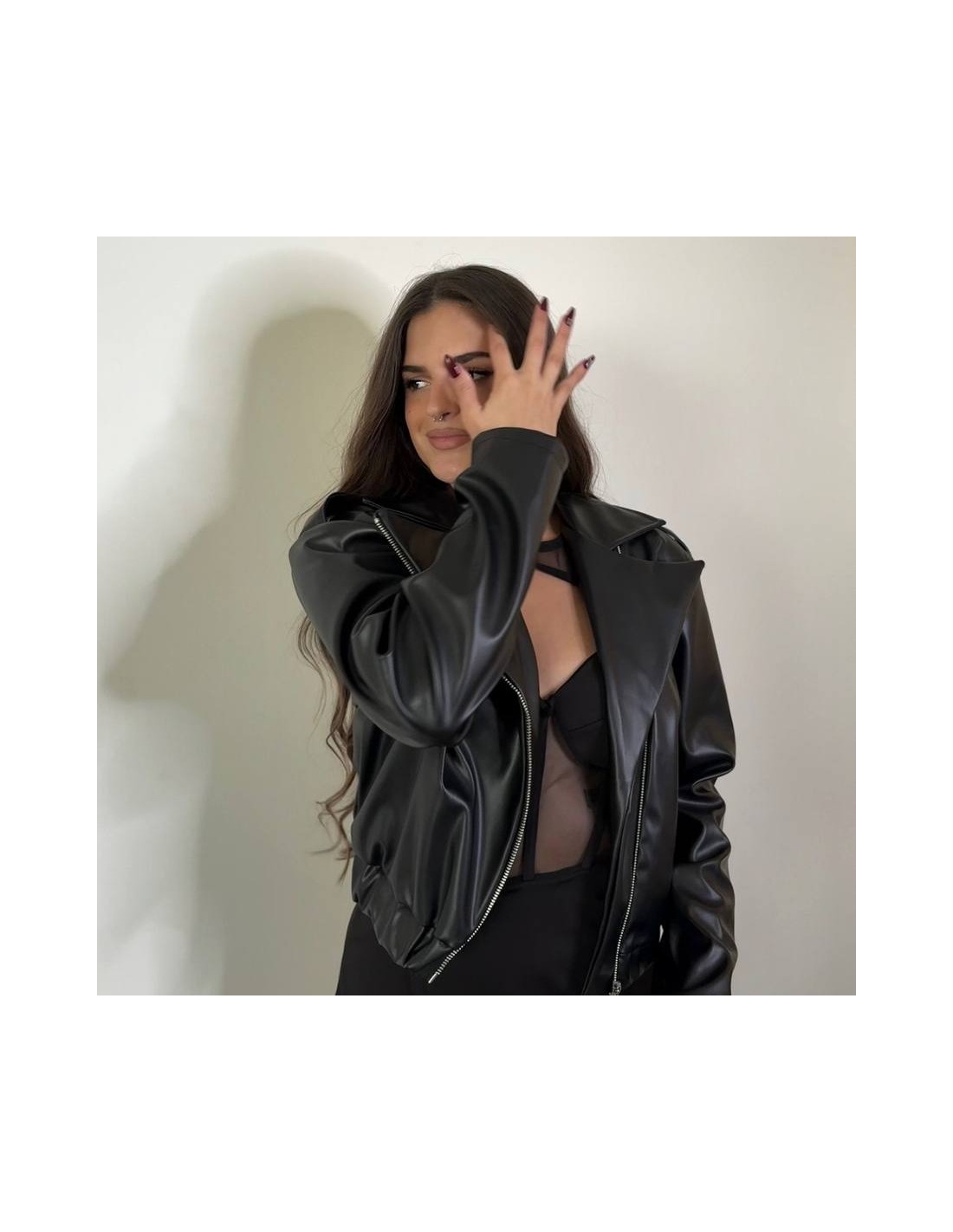 Cazadora efecto piel en tono negro. Cuello de solapa. Cierre delantero con cremallera. De manga larga. Talla única