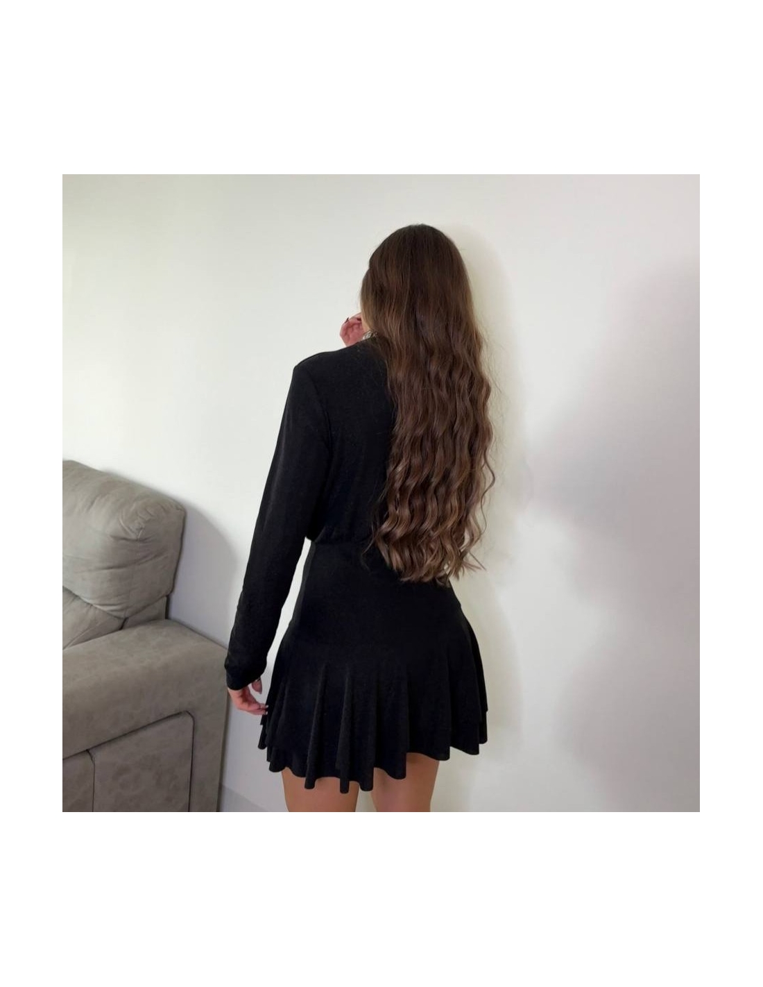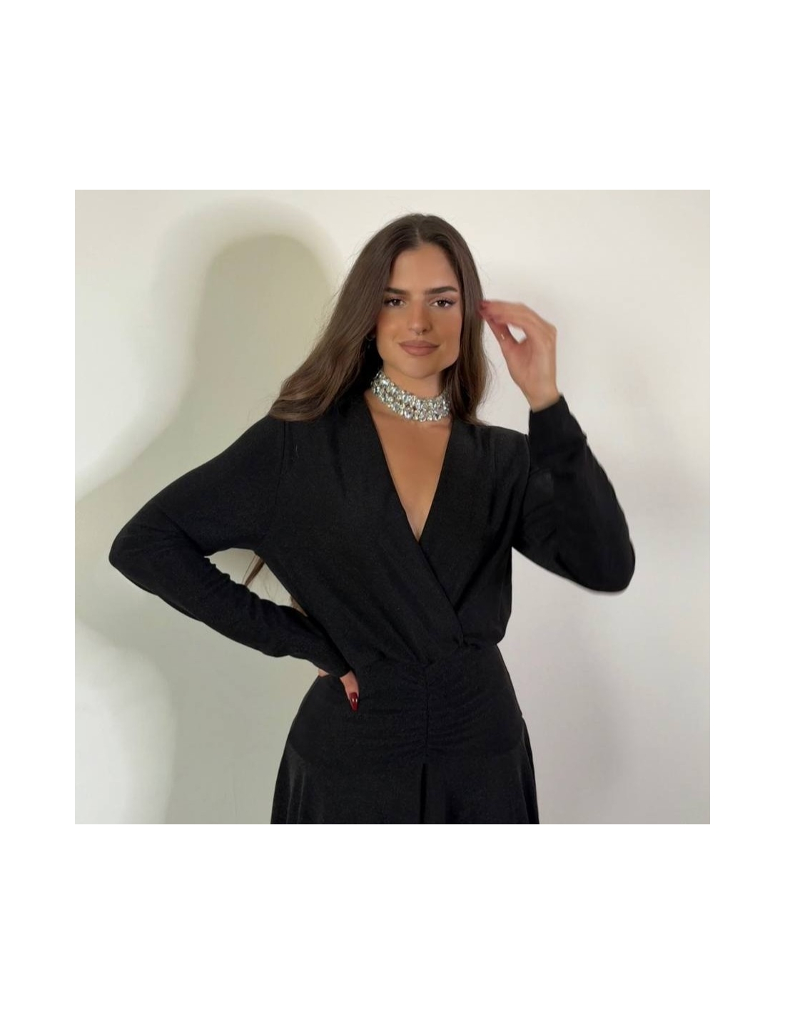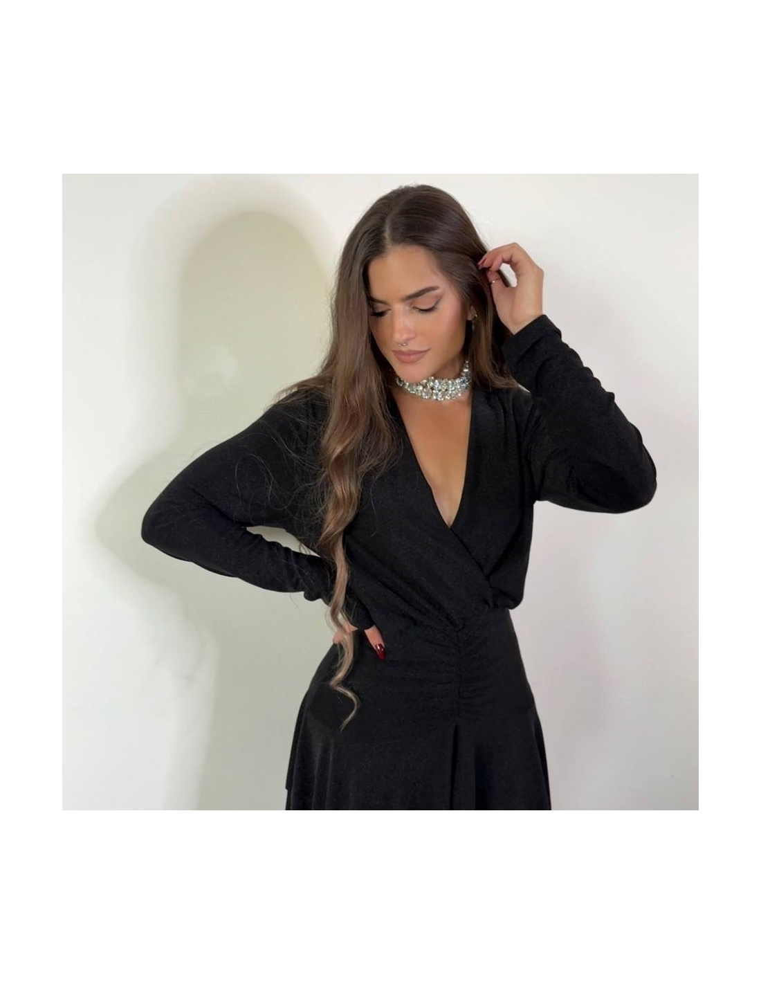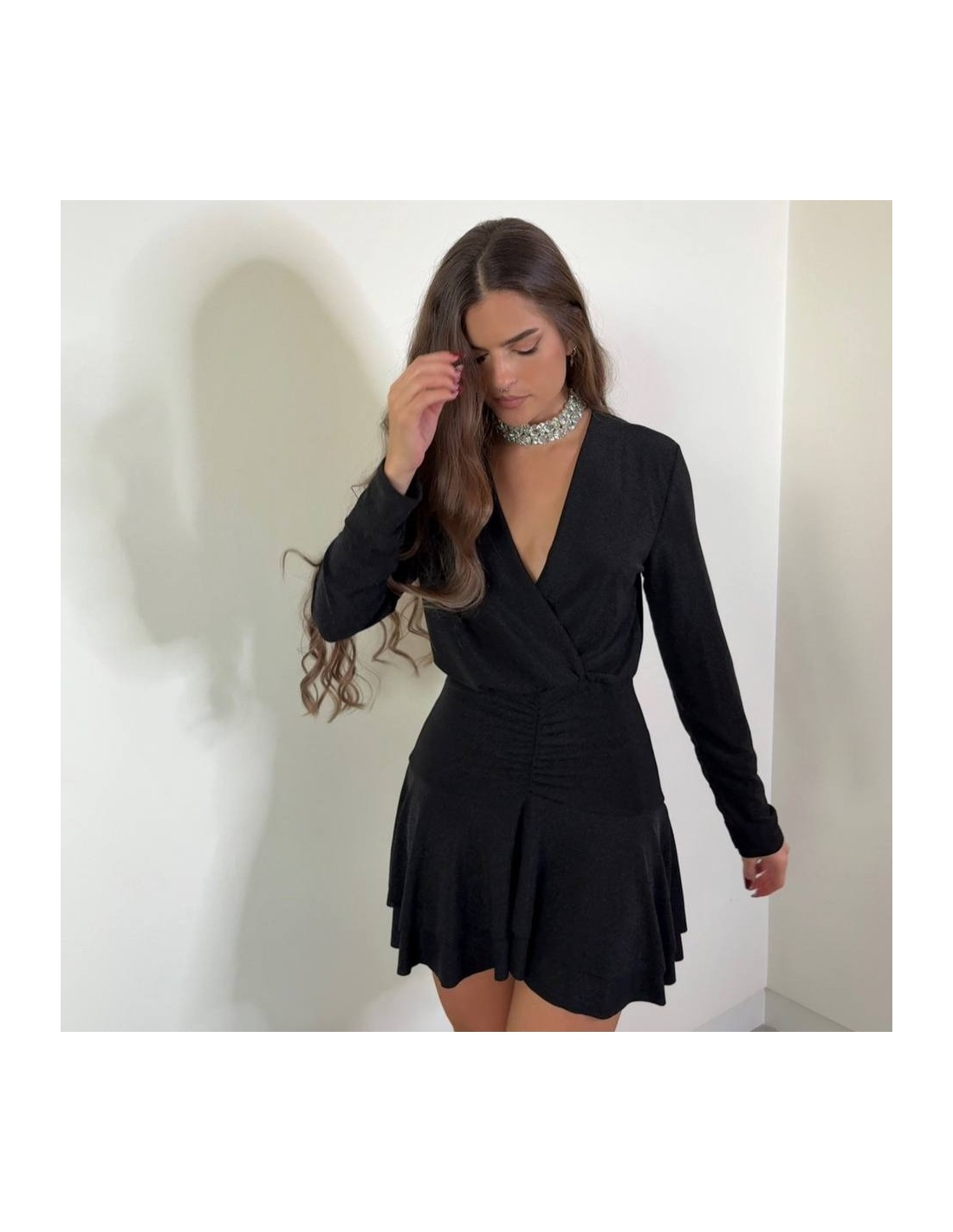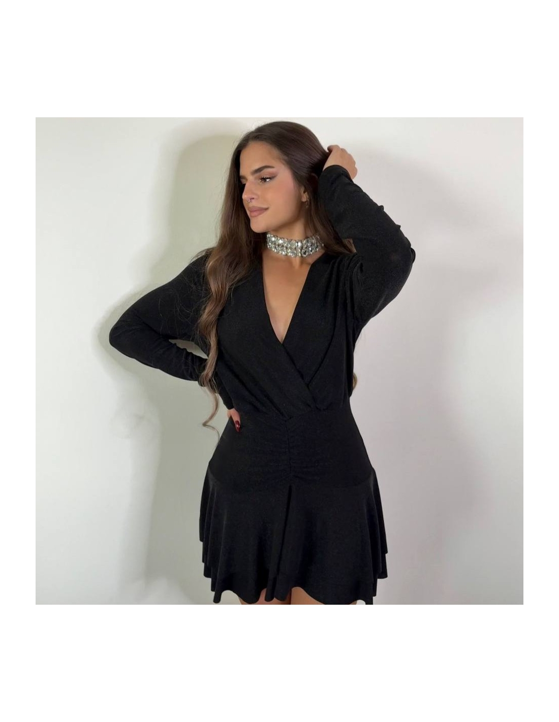 Vestido corto lurex en tono negro. De manga larga. Escote en V. Super elástico, apto hasta talla XL. Talla única