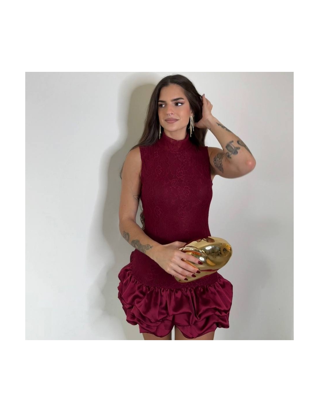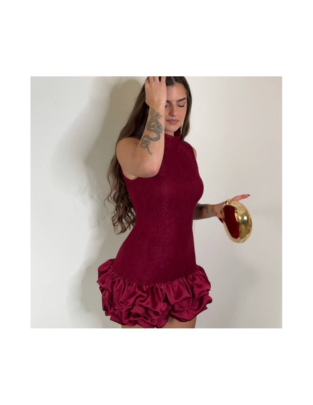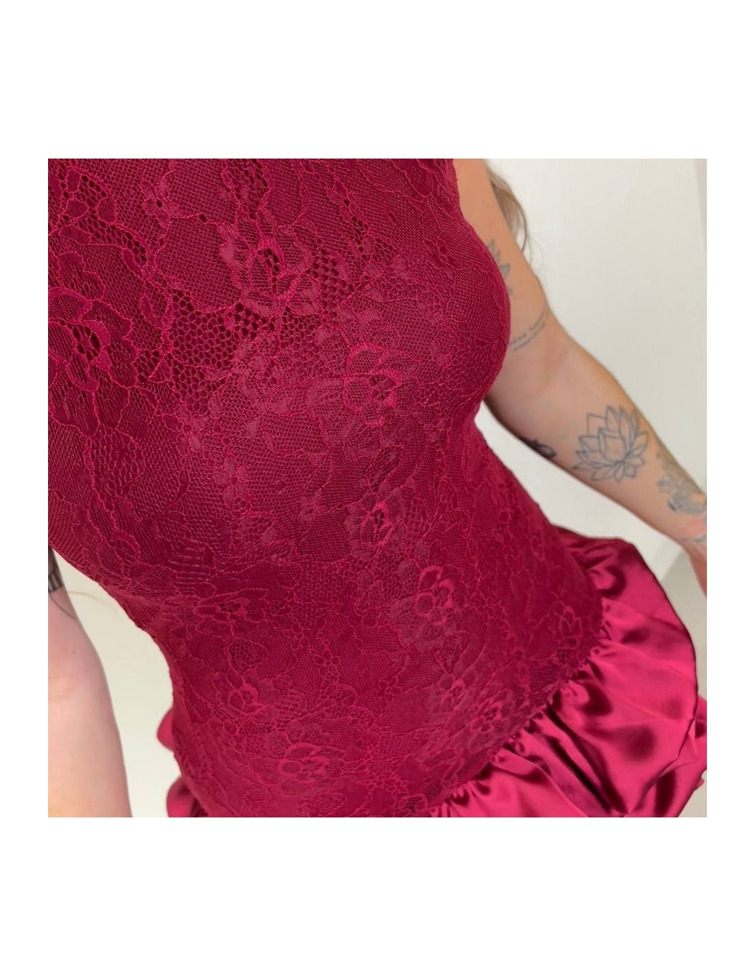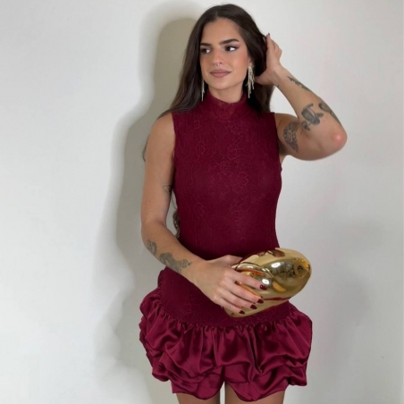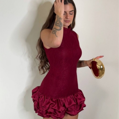 Vestido corto de encaje en tono vino. Volantitos en bajo a tono. Con forro interior a tono. Talla única