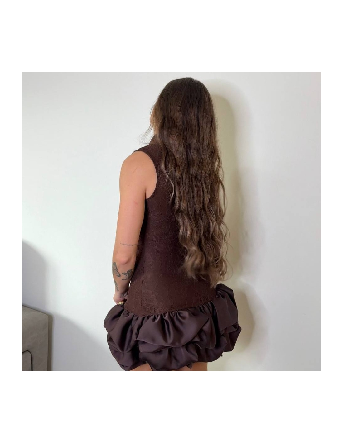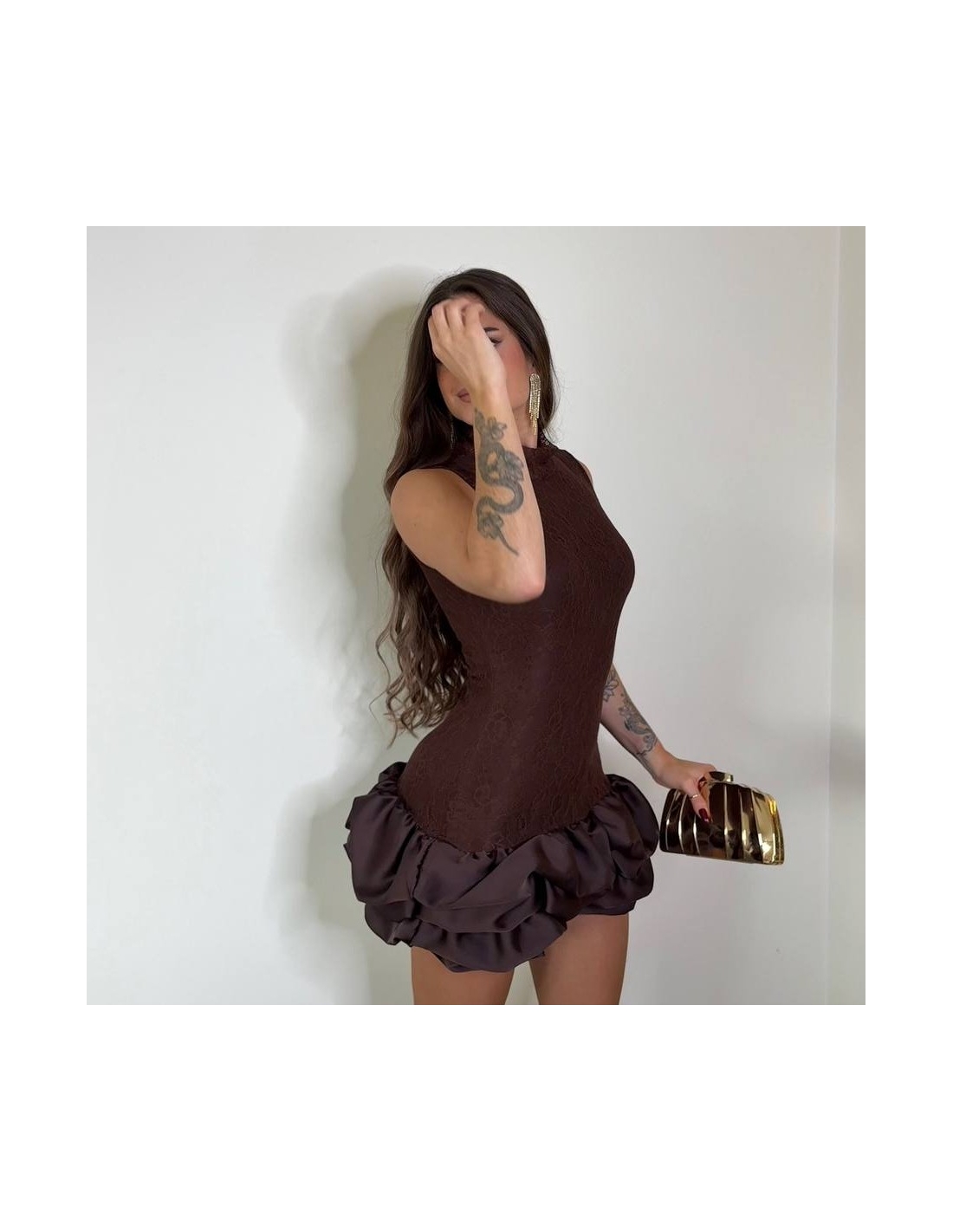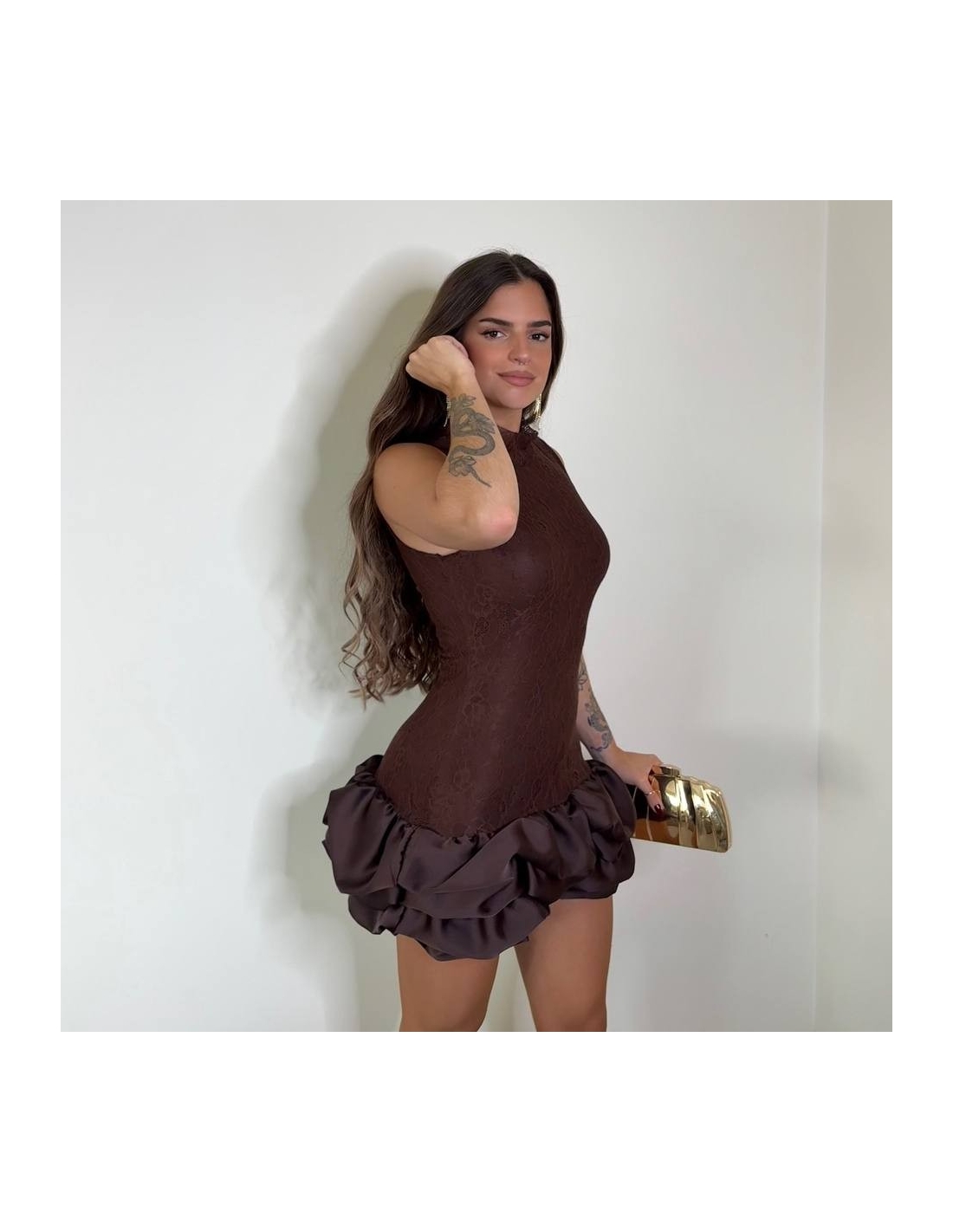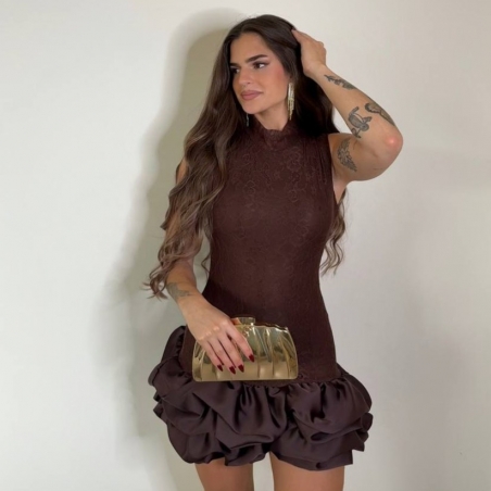 Vestido corto de encaje en tono chocolate. Volantitos en bajo a tono. Con forro interior a tono. Talla única