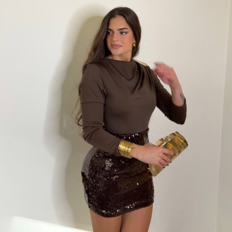 Falda lentejuelas corta con cintura elástica. Forro interior. Talla única.
