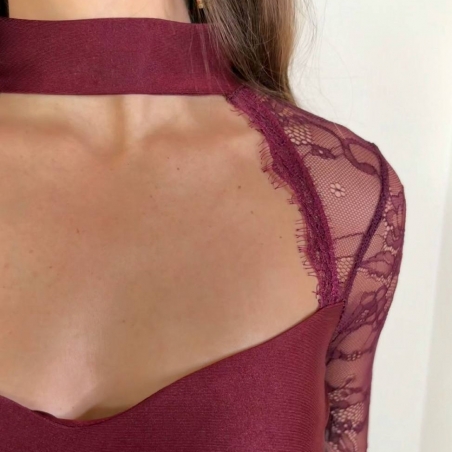Vestido corto en tono rojo vino. Manga encaje a tono. Abertura en escote. Elástico. Talla única