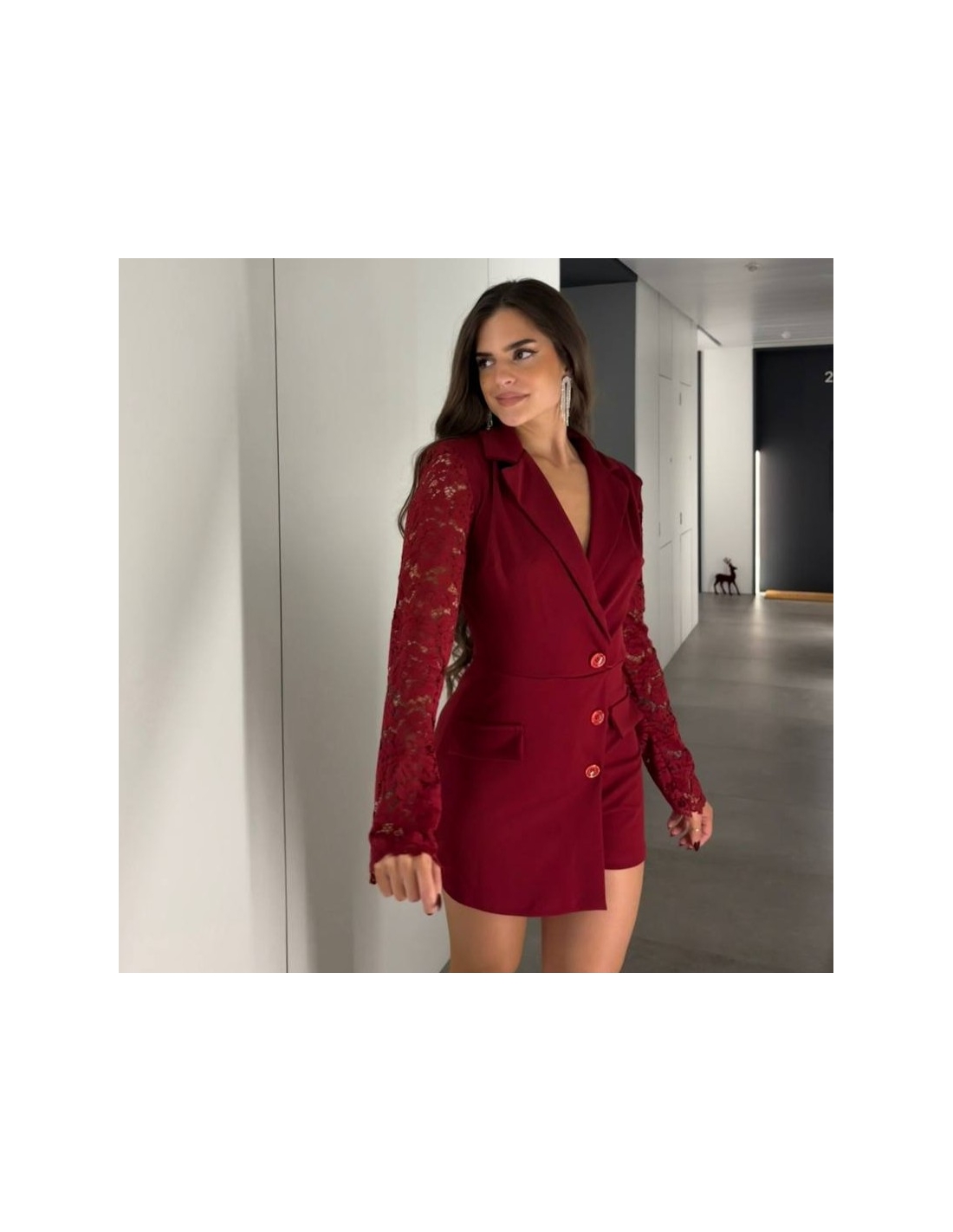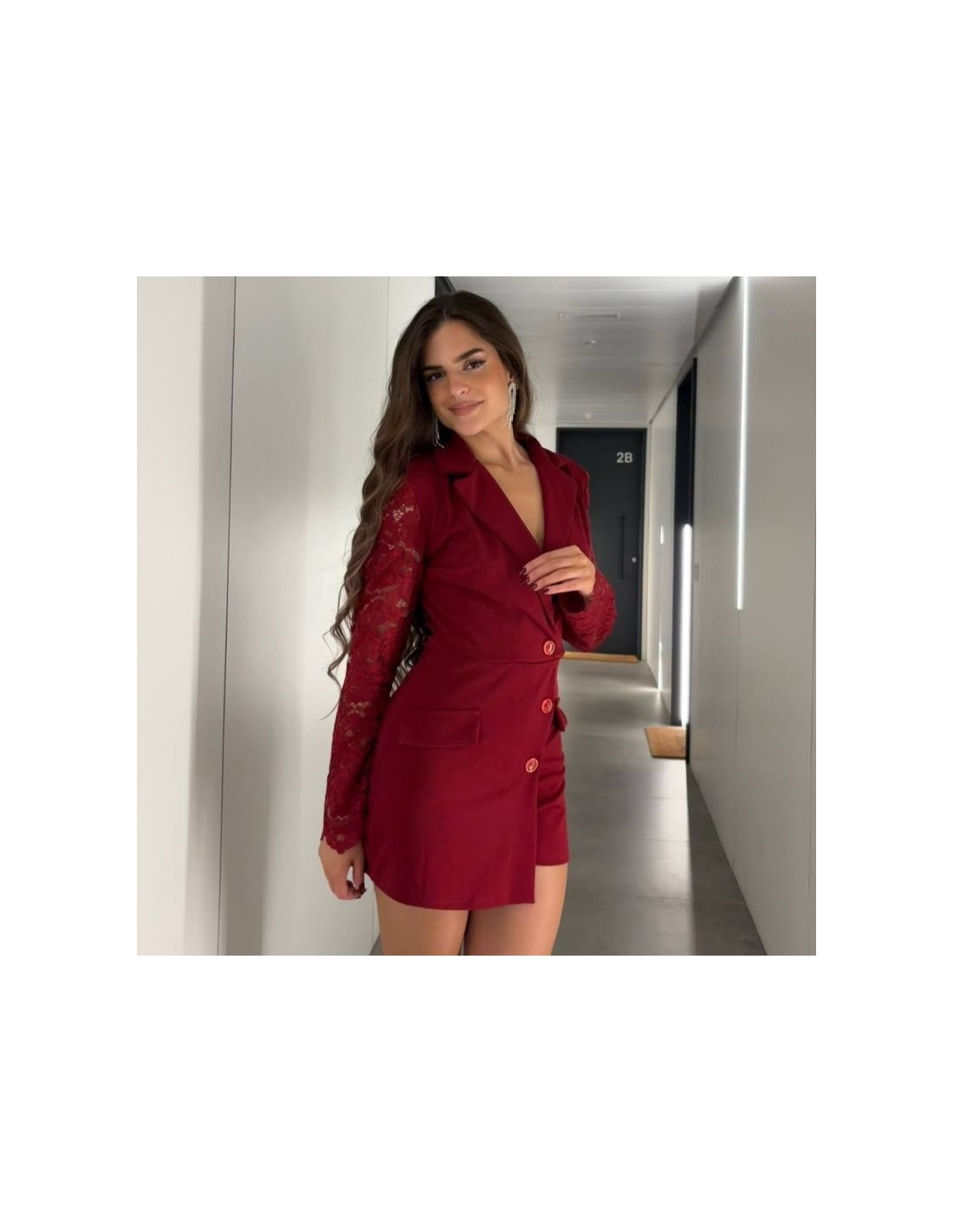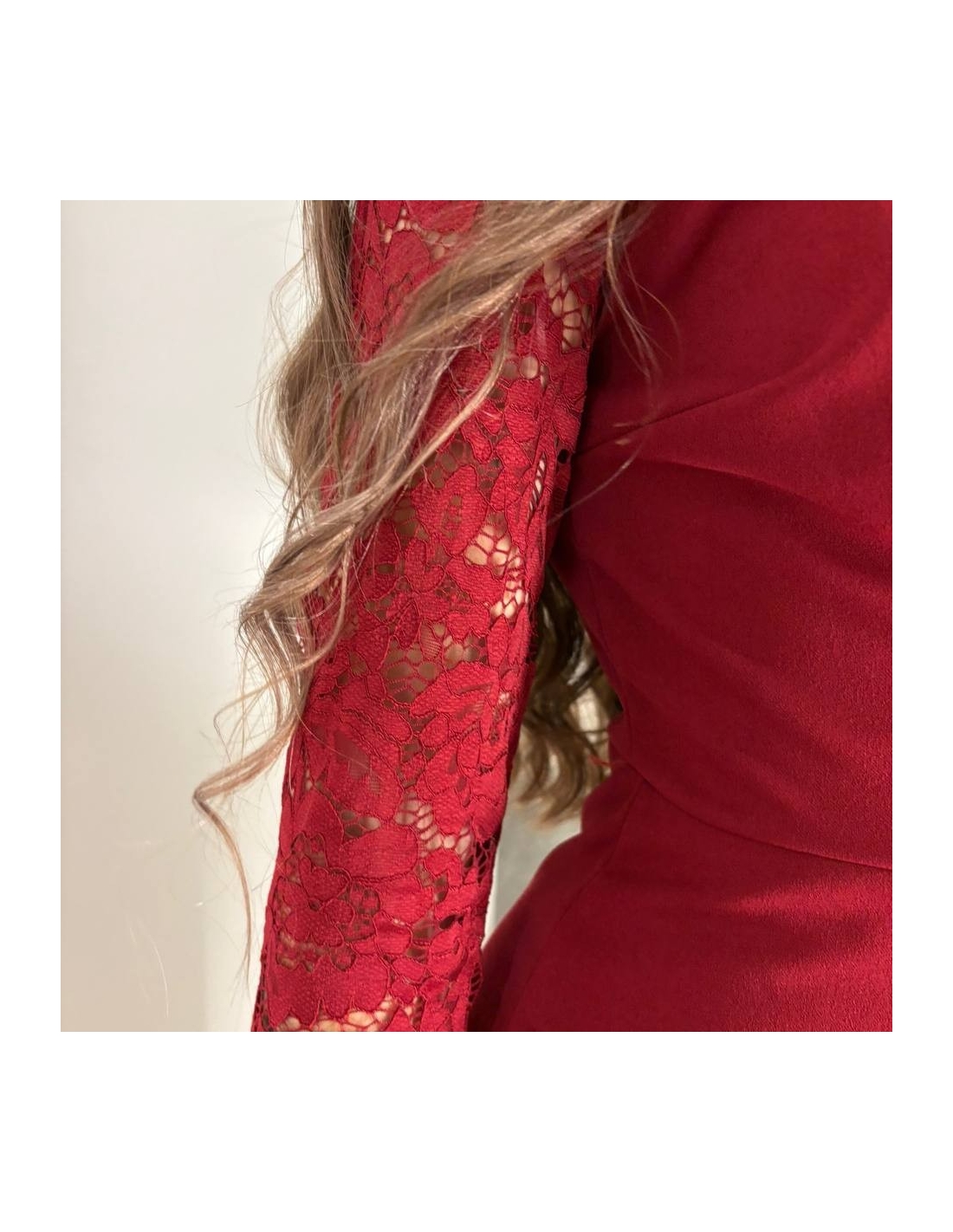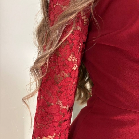 Mono corto abotonado en tono rojo. Con mangas encaje a tono. Escote en V. Cuello de solapa. Talla única