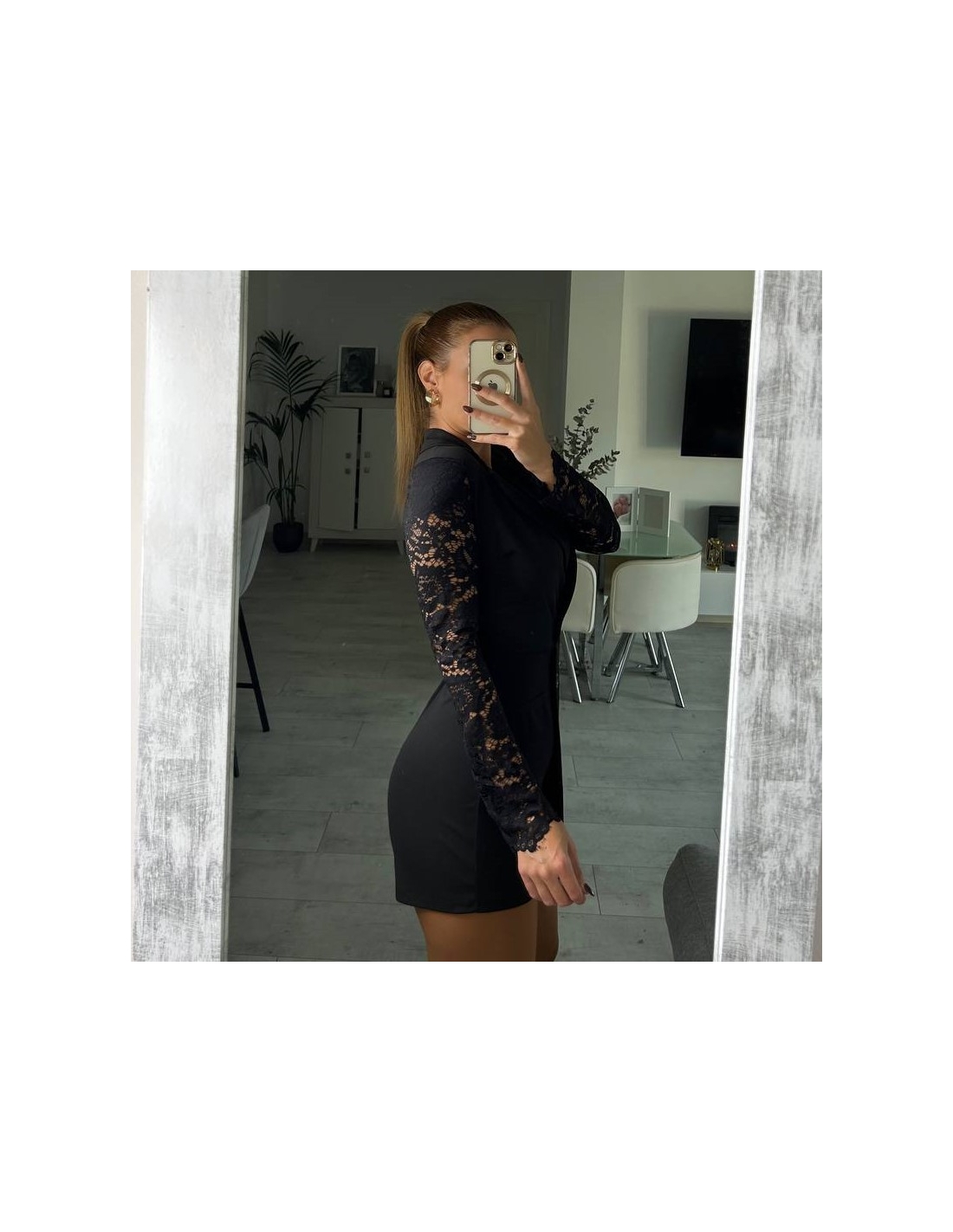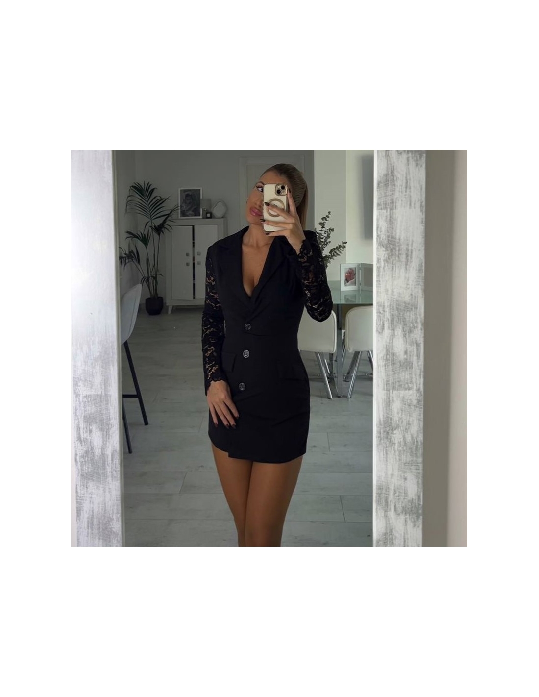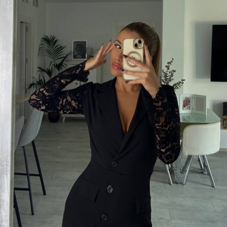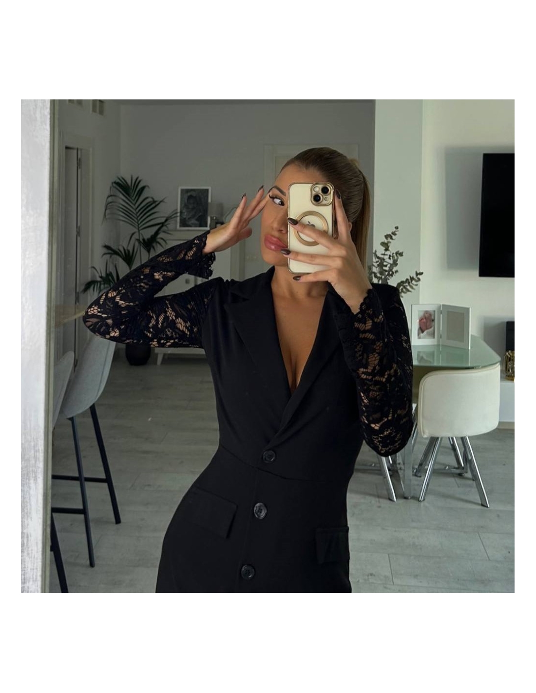 Mono corto abotonado Con mangas encaje a tono. Escote en V. Cuello de solapa. Talla única