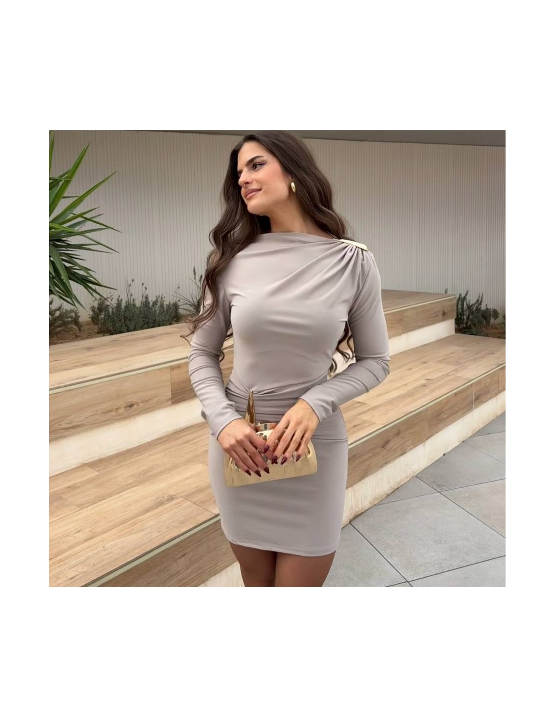 Vestido lágrima dorada. Fruncido delantero. De manga larga. Talla única.