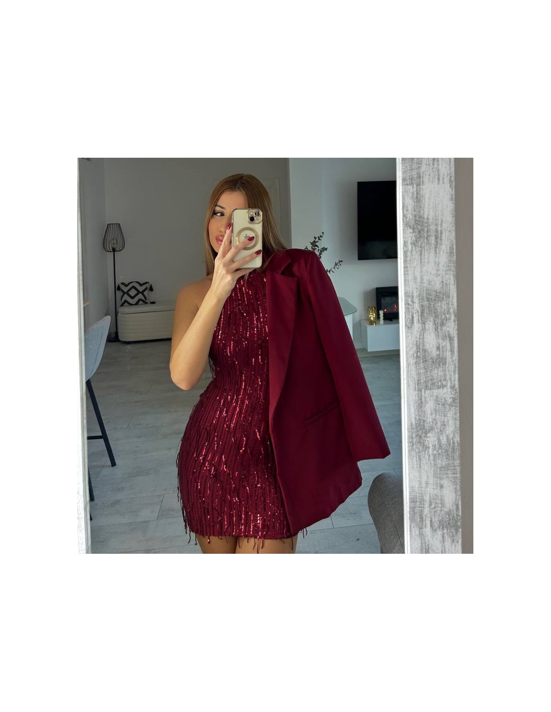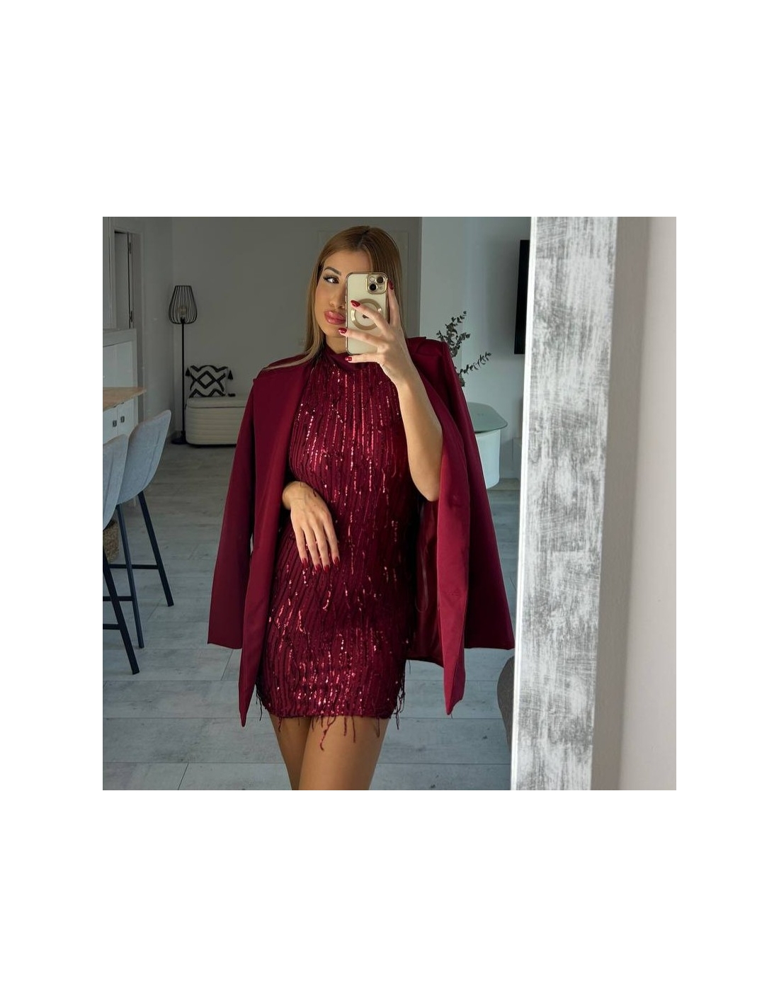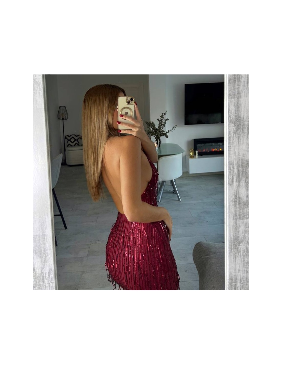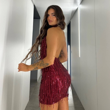 Vestido corto de flecos con lentejuelas en tono vino. Escote en espalda. Con forro interior a tono. Regulable con lazada a tono en el cuello. Talla única