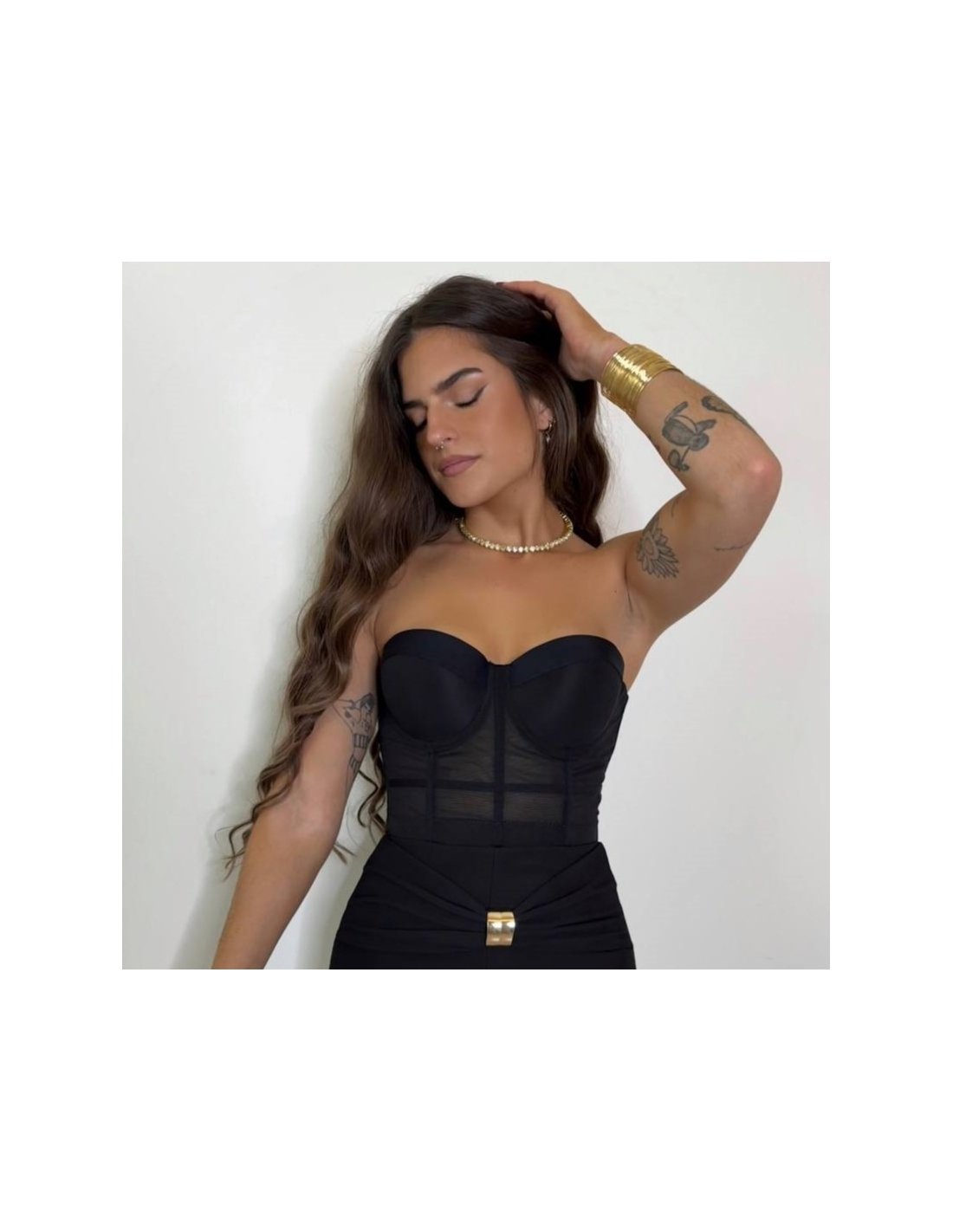 Corset negro en tono negro. Regulable con corchetes en parte trasera. Con casco incorporado.