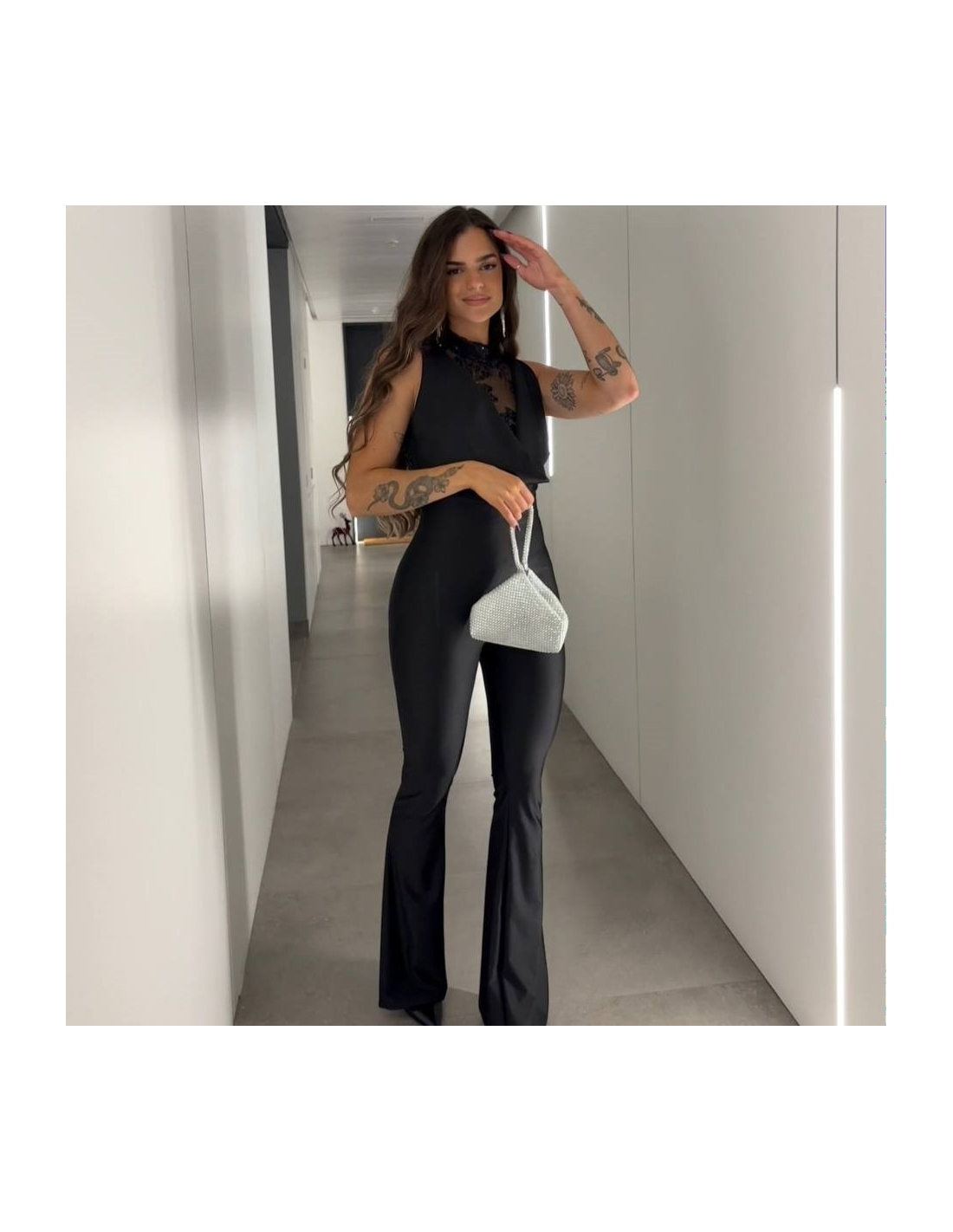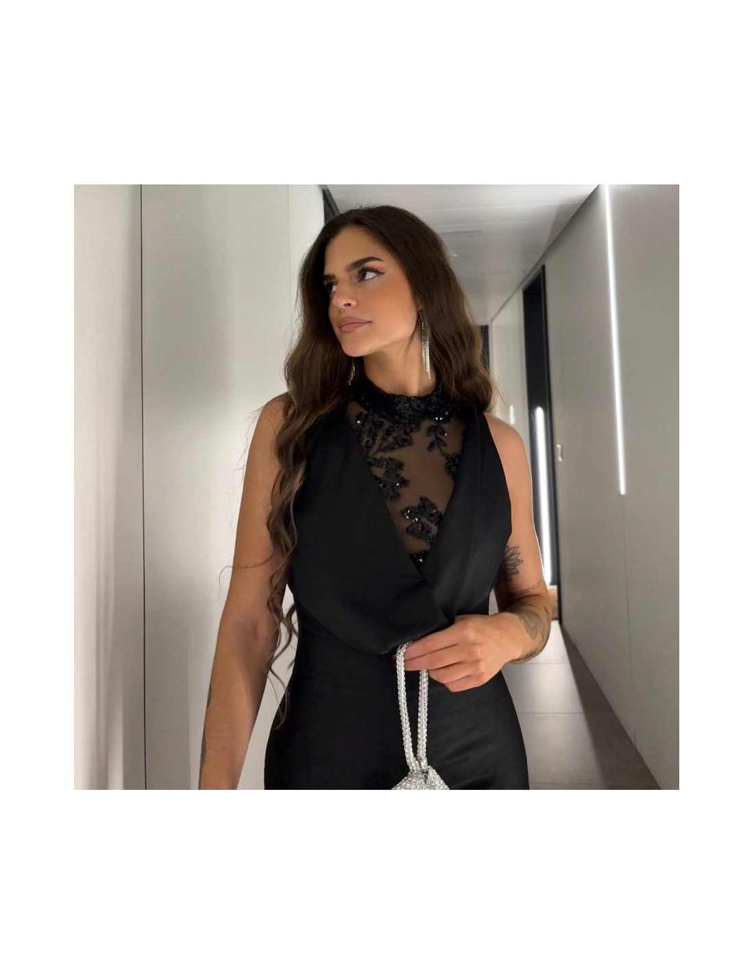 Mono largo ajustado con escote de tul con lentejuelas fluído. Cierre trasero con cremallera oculta. Talla única.