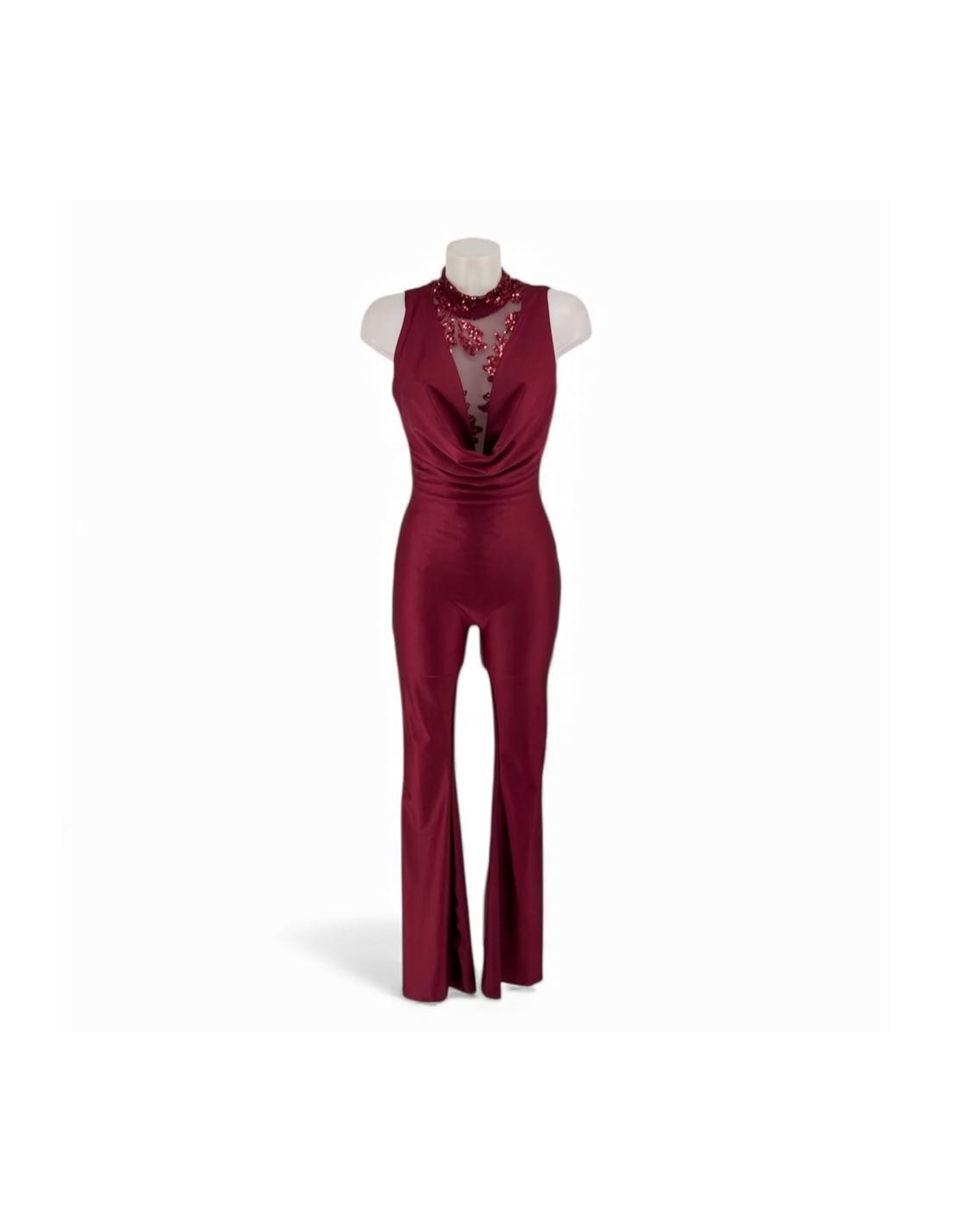 Mono largo ajustado con escote de tul con lentejuelas fluído. Cierre trasero con cremallera oculta. Talla única.
