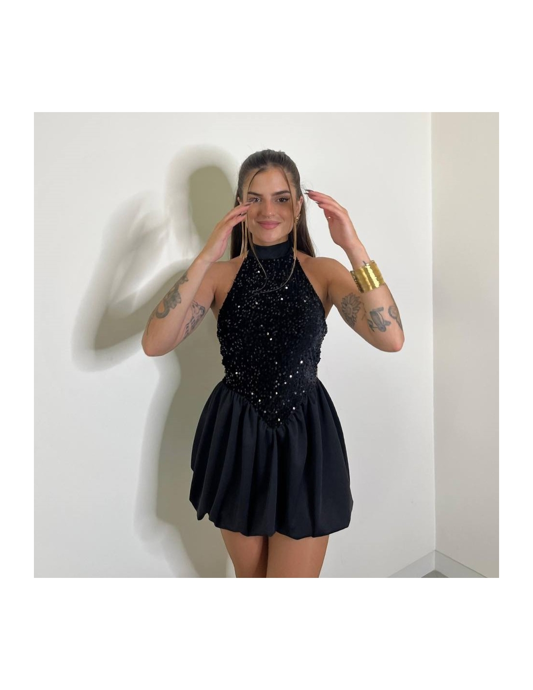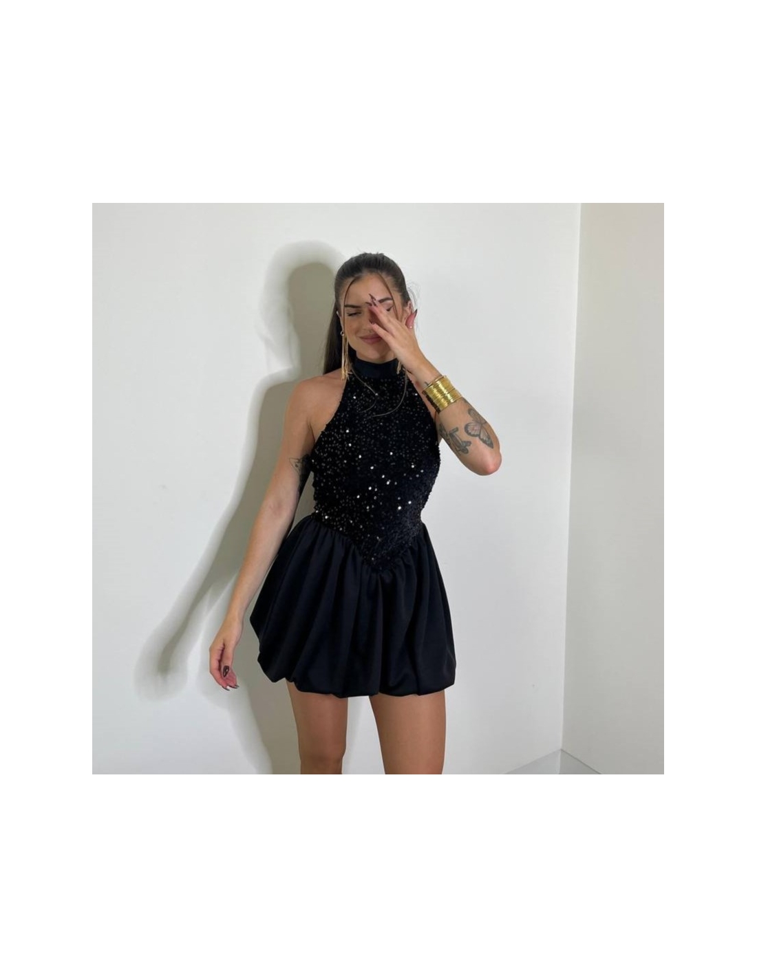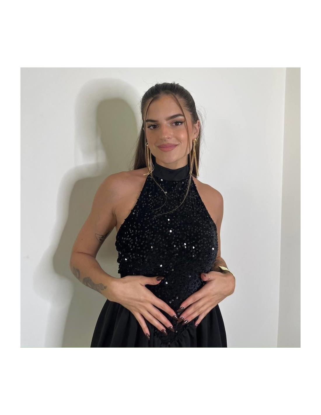 Vestido globo halter negro con lentejuela flexible a tono. Regulable con lazada al cuello. Con forro interior a tono. Talla única