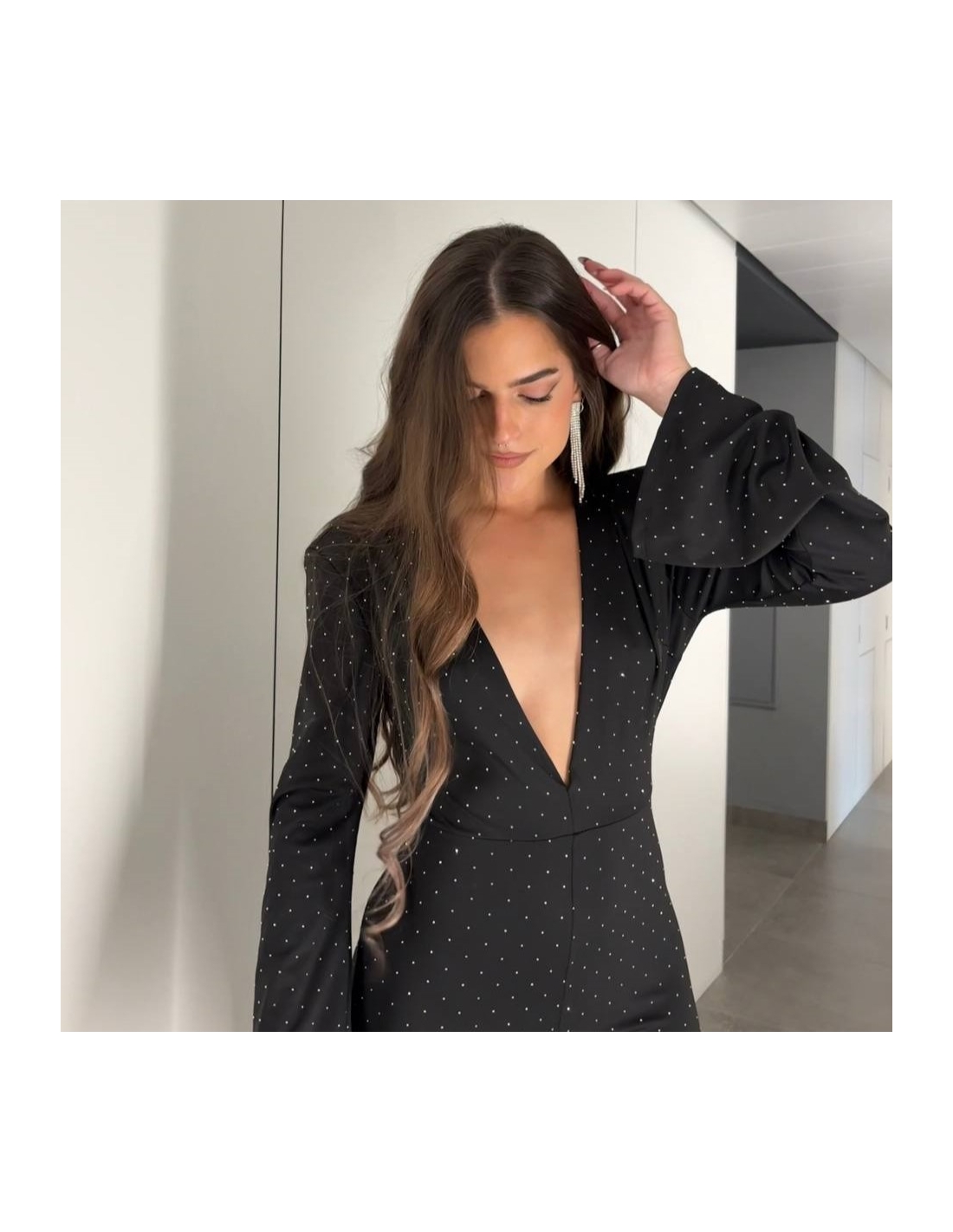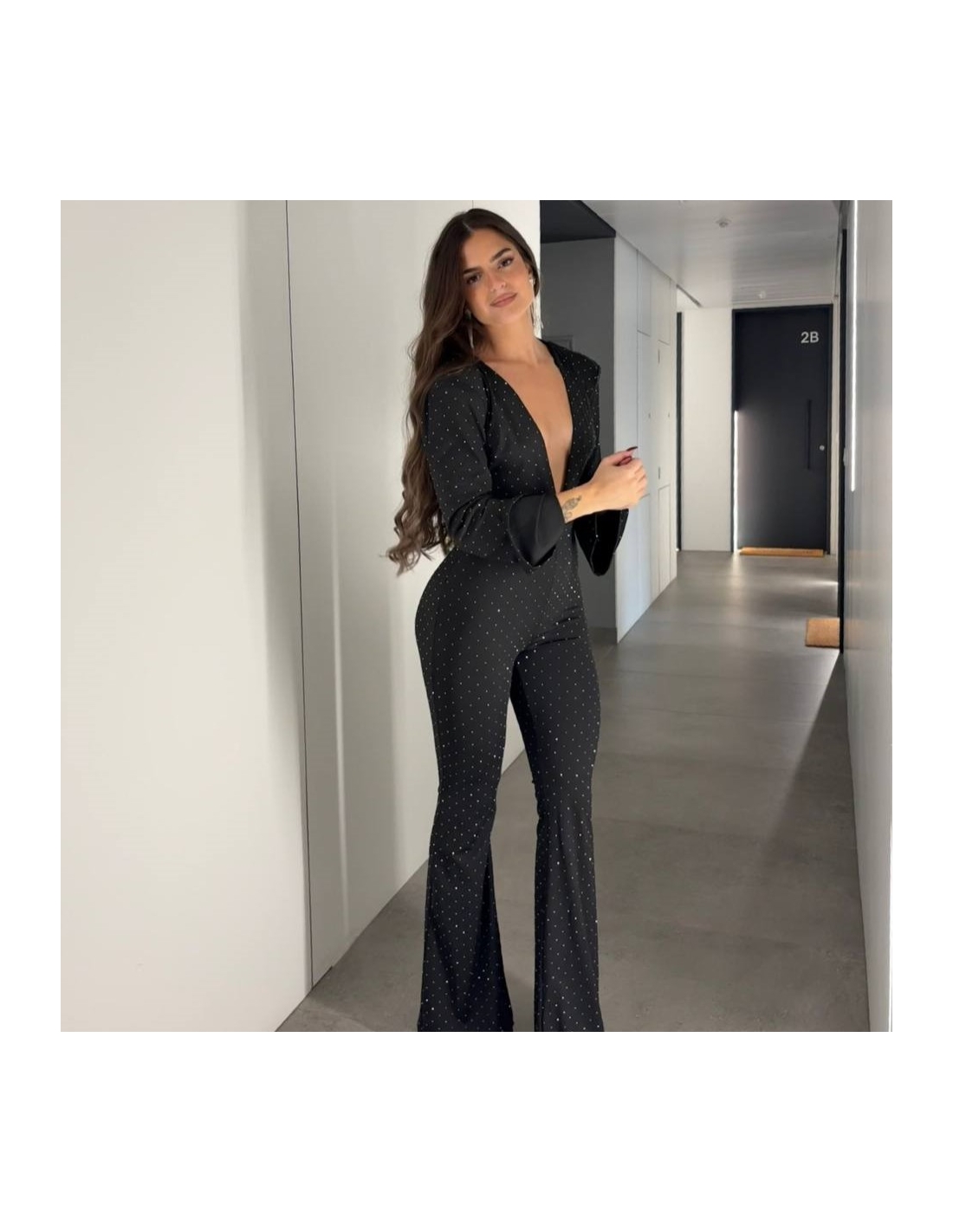 Mono hombreras tachas de manga larga. Escote en V. Fruncido en parte trasera. Elástico. Talla única