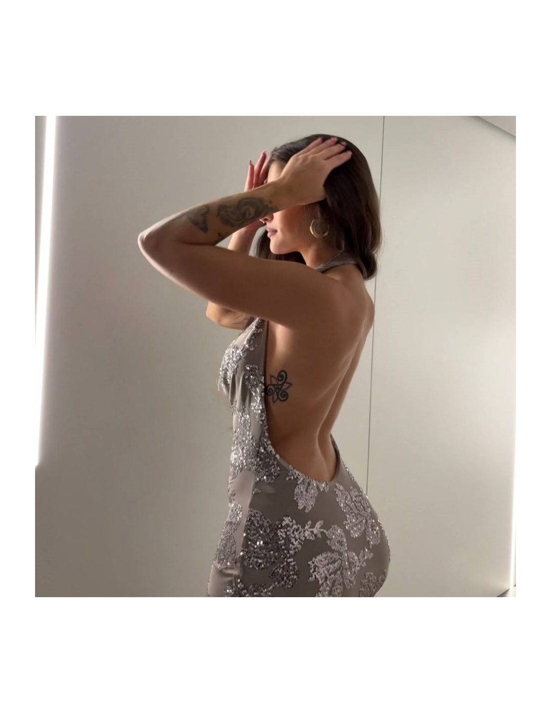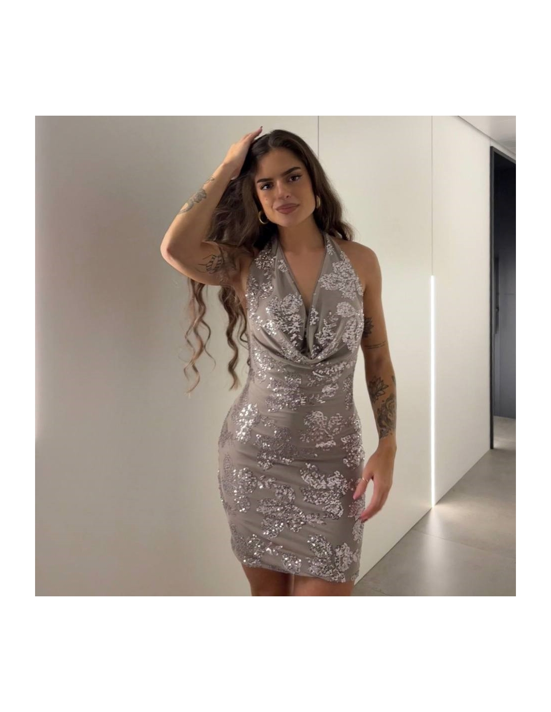 Vestido corto lentejuelas en tono taupé. Escote fluido. Talla única