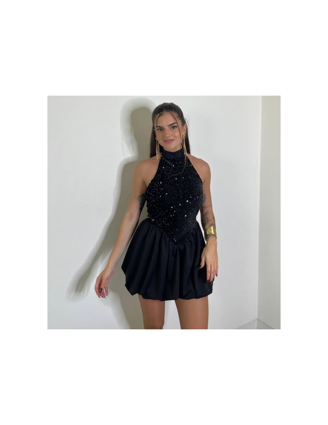Vestido globo halter negro con lentejuela flexible a tono. Regulable con lazada al cuello. Con forro interior a tono. Talla única
