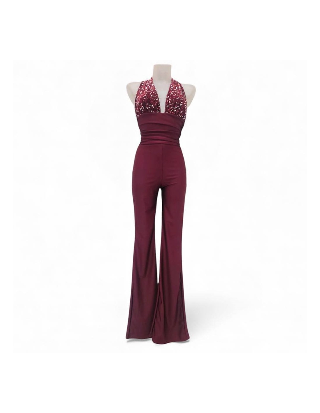 Mono de campana largo con escote de lentejuelas. Regulable con lazada trasera. Elástico. Escote en V. Talla única