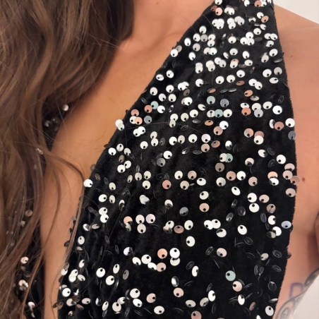 Mono de campana largo con escote de lentejuelas. Regulable con lazada trasera. Elástico. Escote en V. Talla única