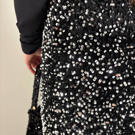 Pantalón flluido de lentejuelas en tono negro y plata. De tiro alto. Cintura elástica. Talla única
