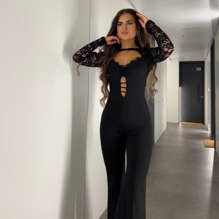 Mono de campana negro. Encaje en parte superior y manga. Escote en espalda. Elástico. Talla única