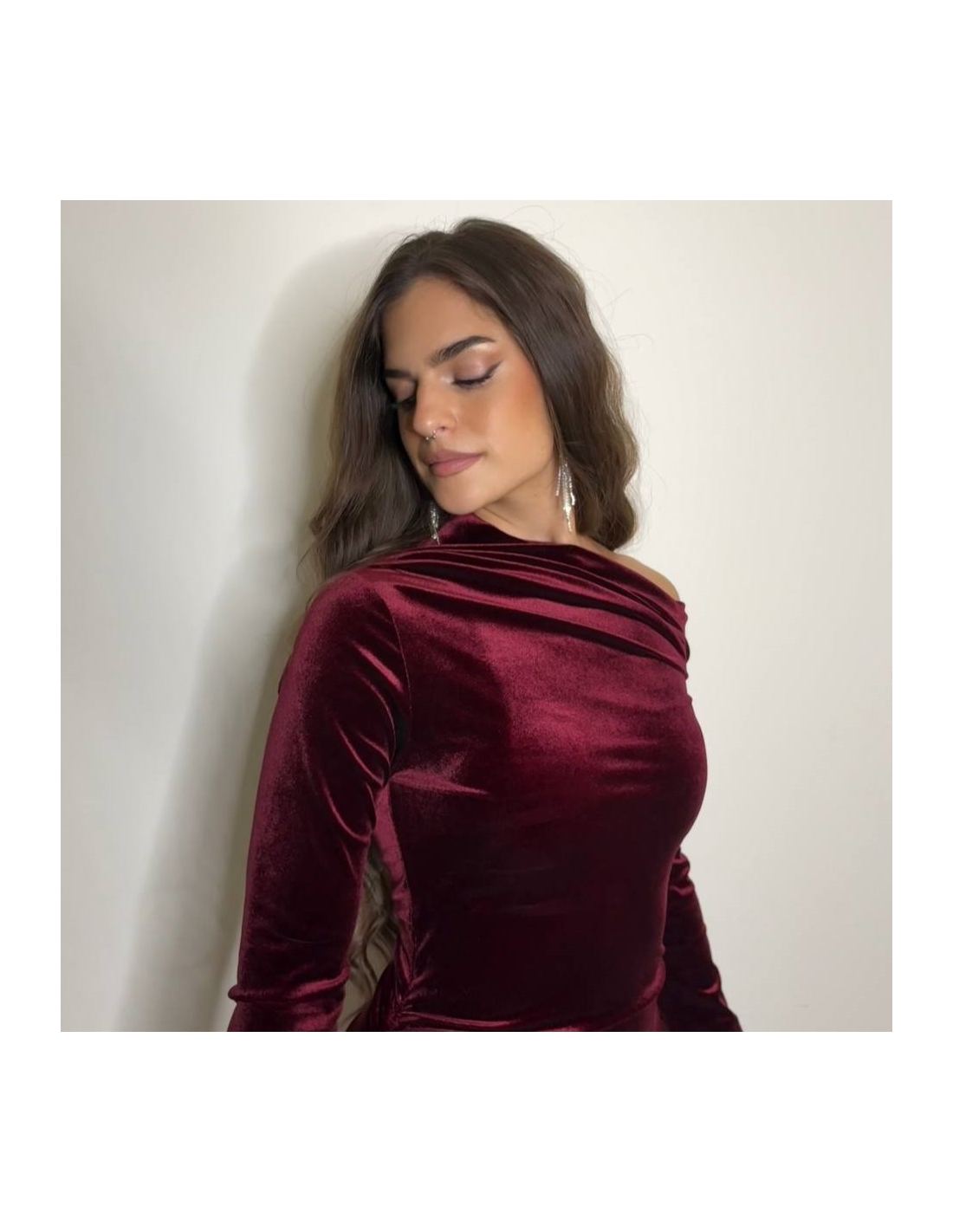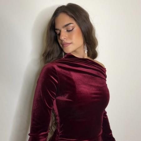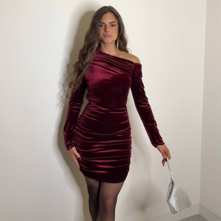 Vestido Fruncido de terciopelo en tono burdeos. Corte asimétrico en hombro. Talla única.
