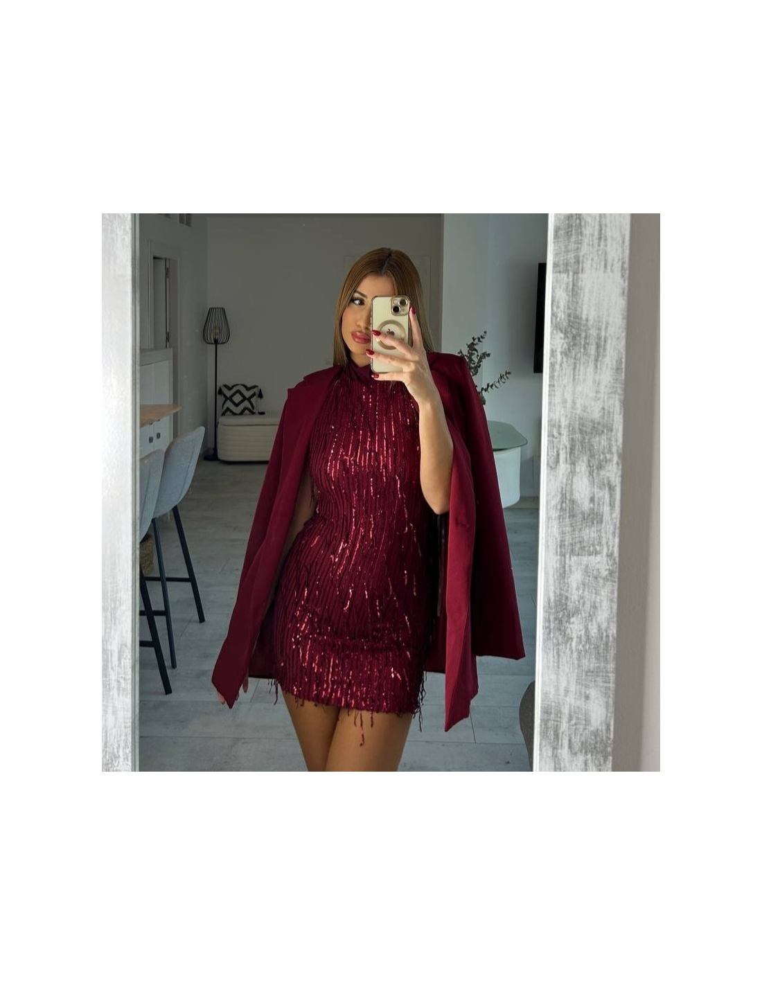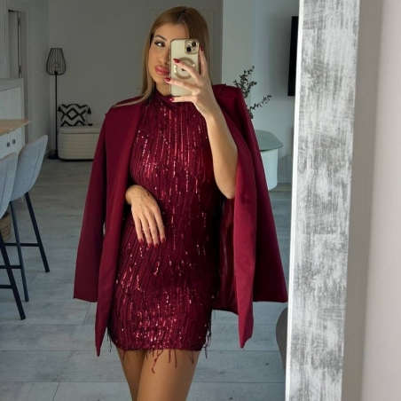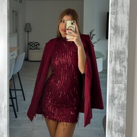 Vestido corto de flecos con lentejuelas en tono vino. Escote en espalda. Con forro interior a tono. Regulable con lazada a tono en el cuello. Talla única