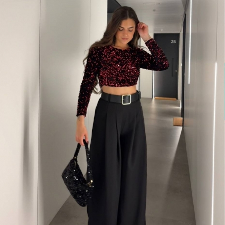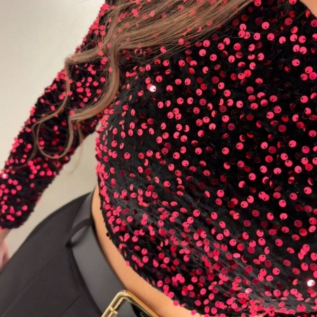 Top lentejuelas en tono negro y vino. De manga larga. Cuello redondo. Con forro interior a tono. Talla única
