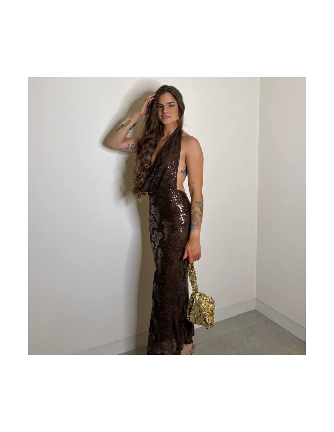 Vestido largo de lentejuelas en tono choco. Escote fluido. Con forro interior a tono. Talla única