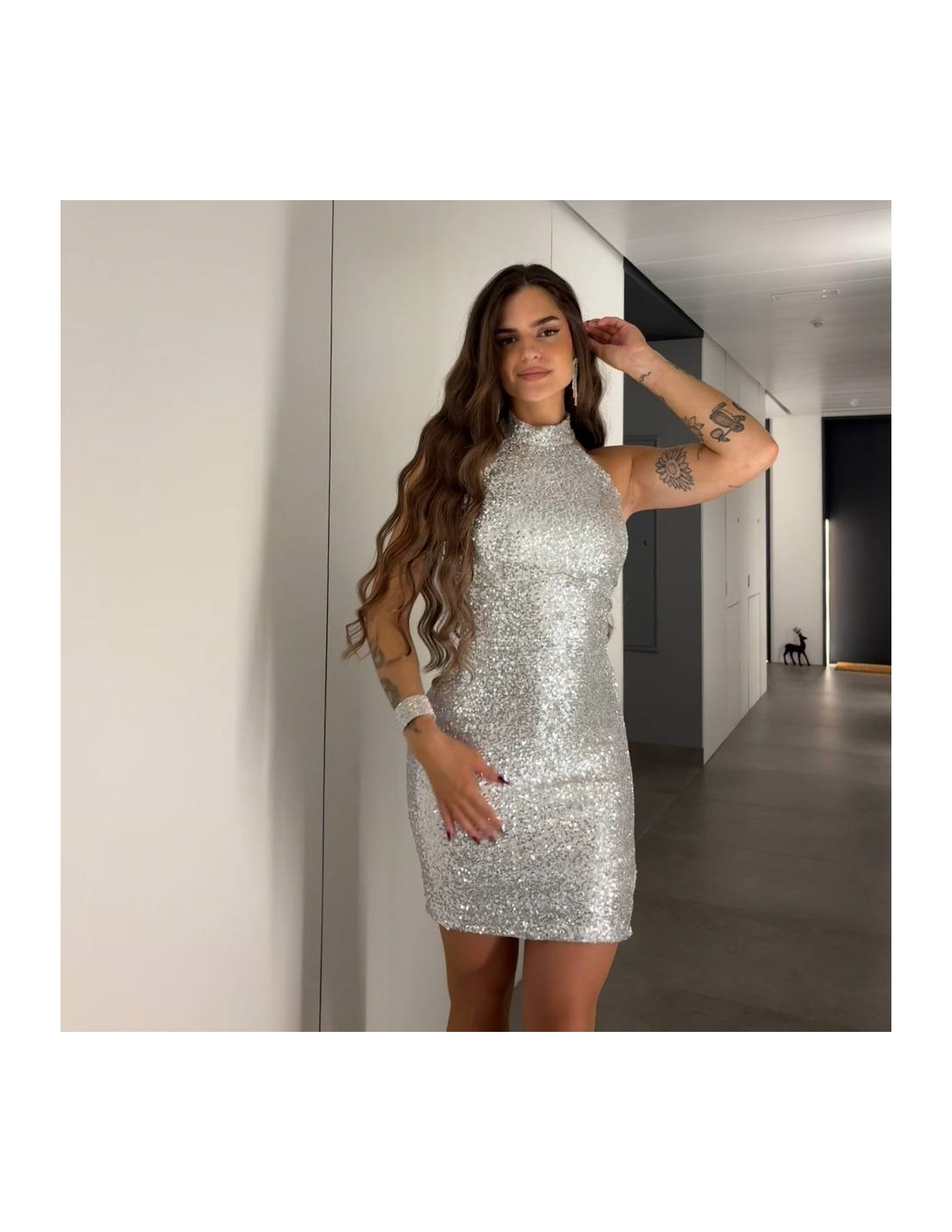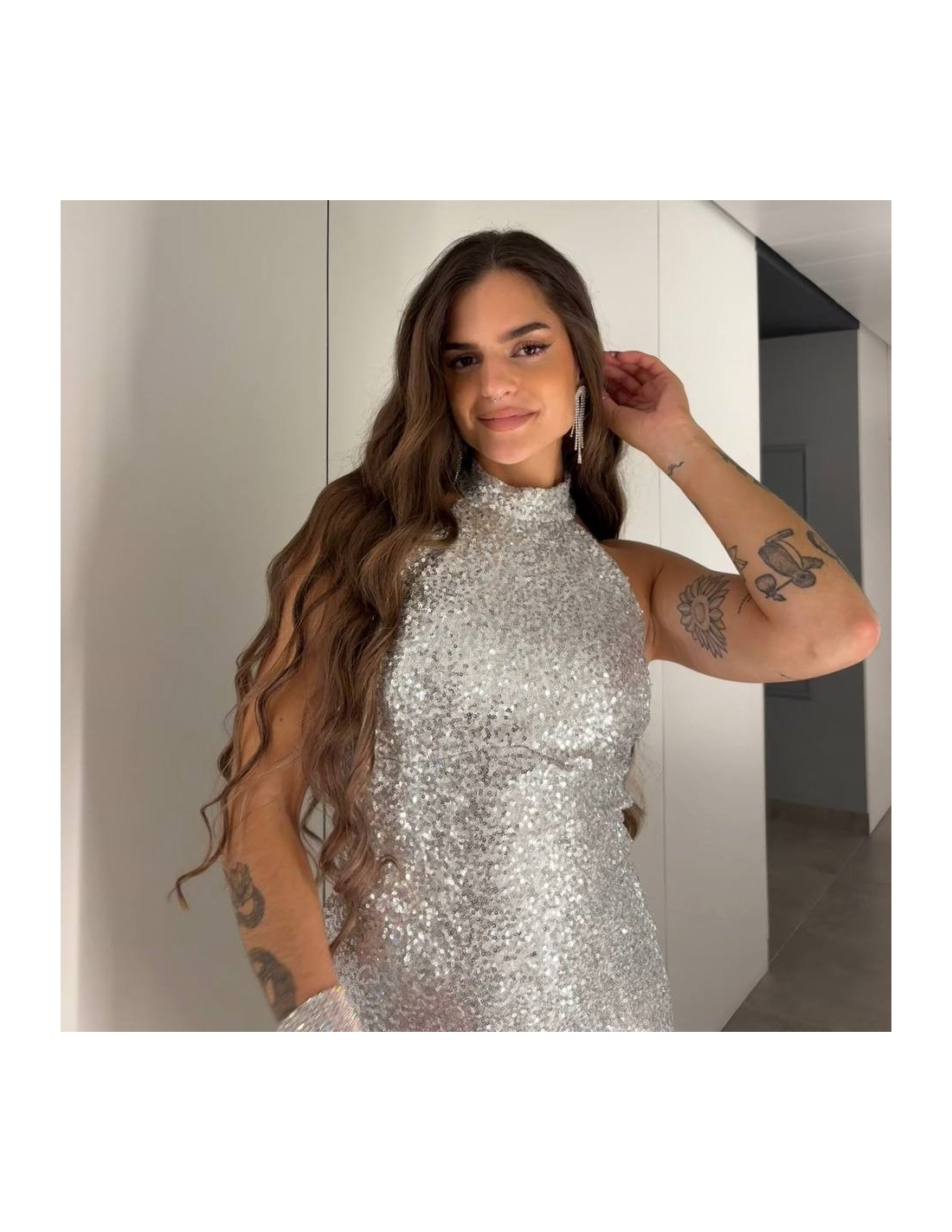 Vestido de lentejuelas en tono plata. Regulable al cuello con botón. Mini abertura lateral. Con forro interior a tono. Talla única