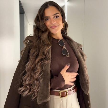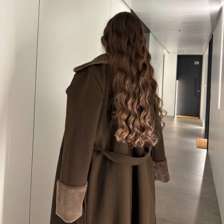 Abrigo de paño con pelito. Cinturón a tono. Cuello de solapa y puños con pelito a tono. Talla única.