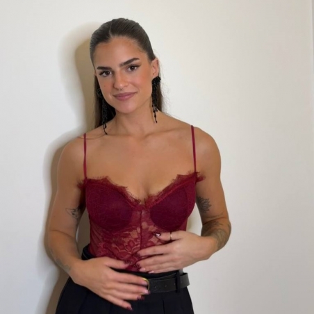 Body encaje vino con cierre en bajo. Tirantas finas a tono. Cierre en bajo. Casco incorporado en la zona del pecho. Transparencias. Talla única