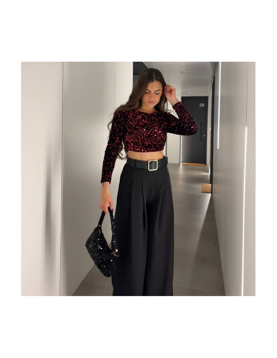 Top lentejuelas en tono negro y vino. De manga larga. Cuello redondo. Con forro interior a tono. Talla única
