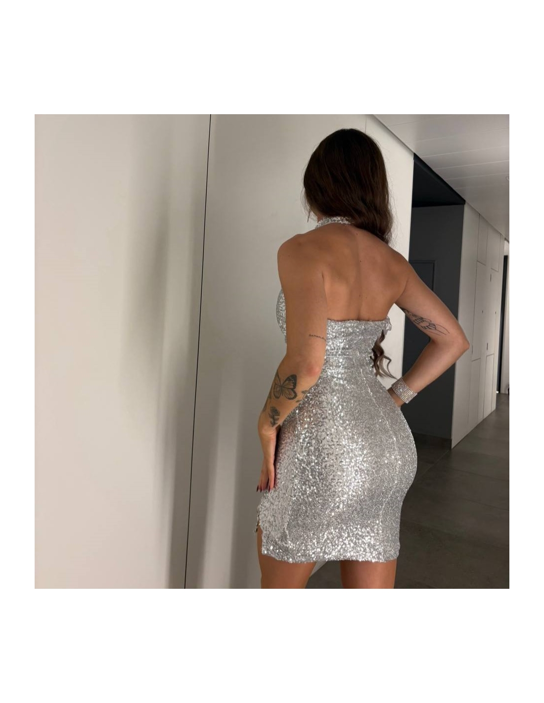 Vestido de lentejuelas en tono plata. Regulable al cuello con botón. Mini abertura lateral. Con forro interior a tono. Talla única