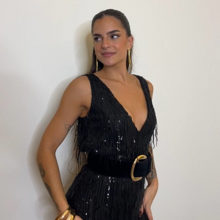 Mono corto de flecos lentejuelas en tono negro. Escote en V en parte delantera y trasera. Con forro interior a tono. Talla única
