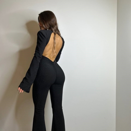 Mono lurex hombreras en tono negro. De campana y manga larga. Escote en V en parte delantera y escote en parte trasera. Elástico. Talla única