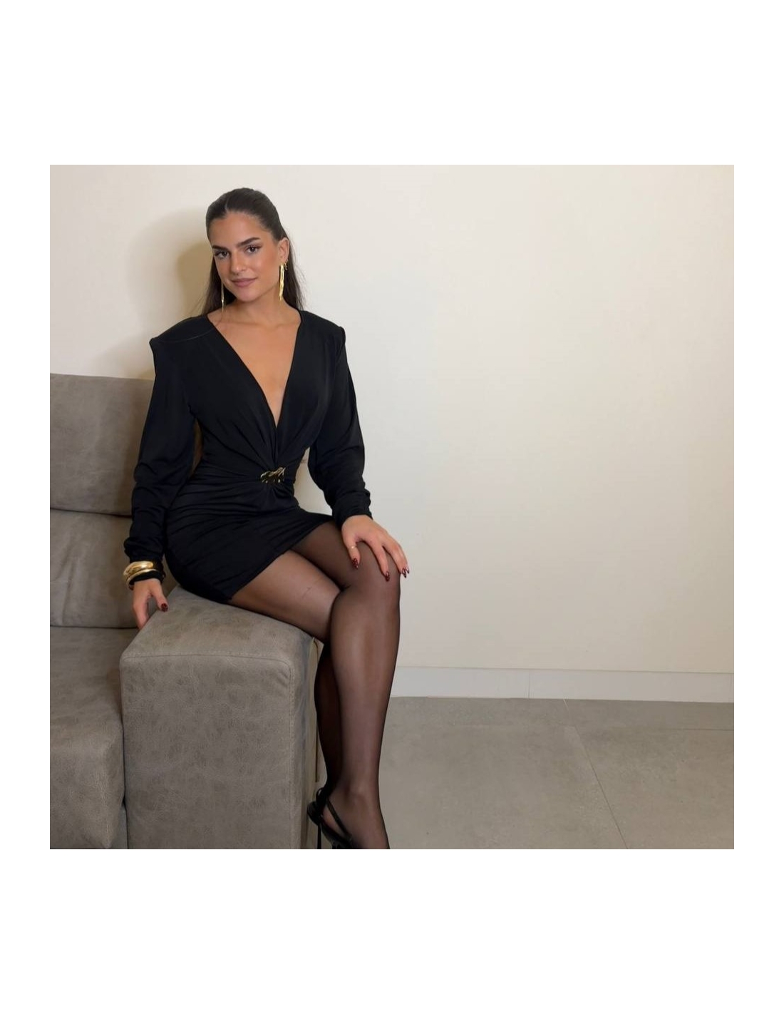 Vestido corto con hombreras en tono negro. De manga larga. Escote en V y joya en tono dorado. Talla única
