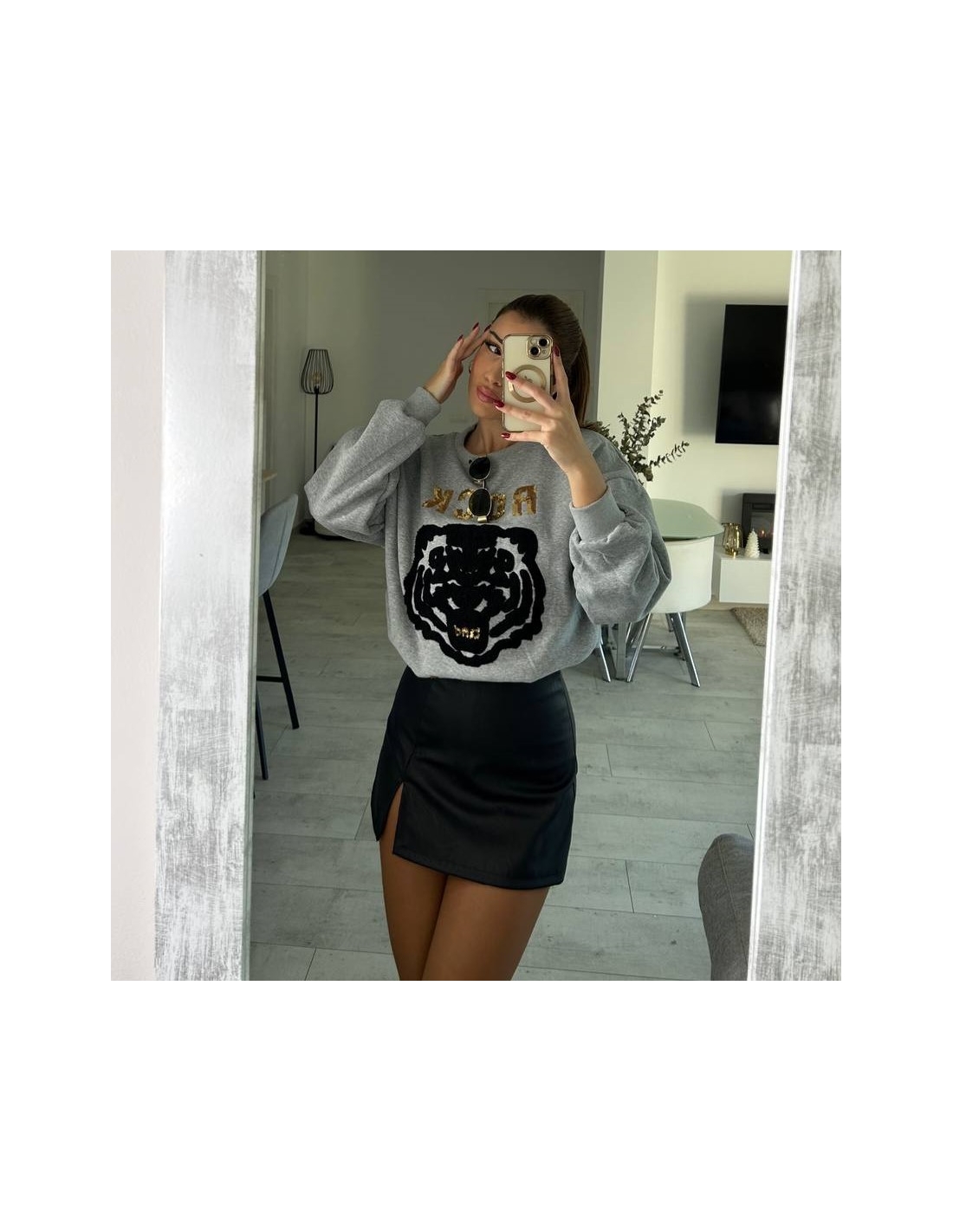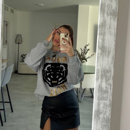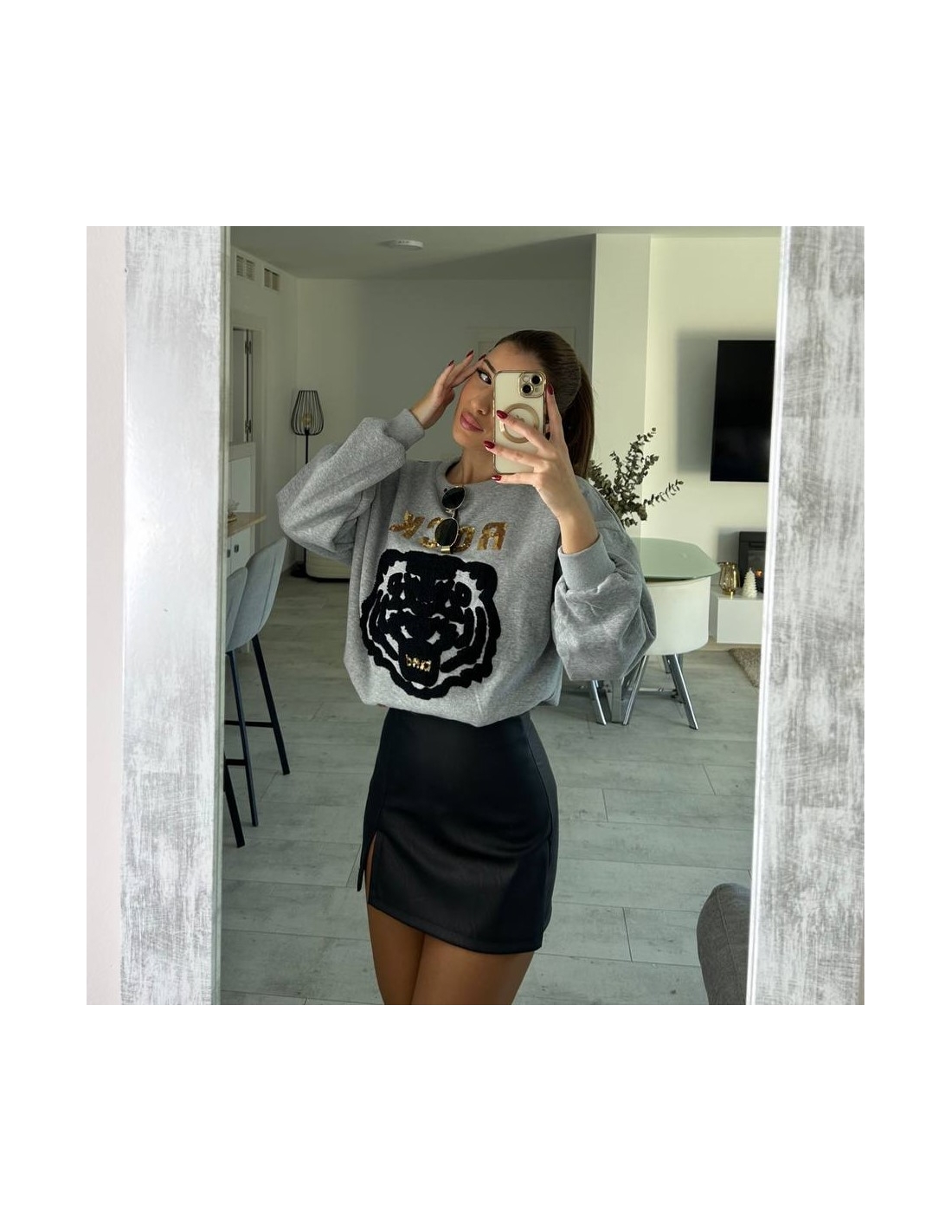 Sudadera gris con estampado en tono negro. De manga larga. Cuello redondo. Con pelito en interior. Talla única