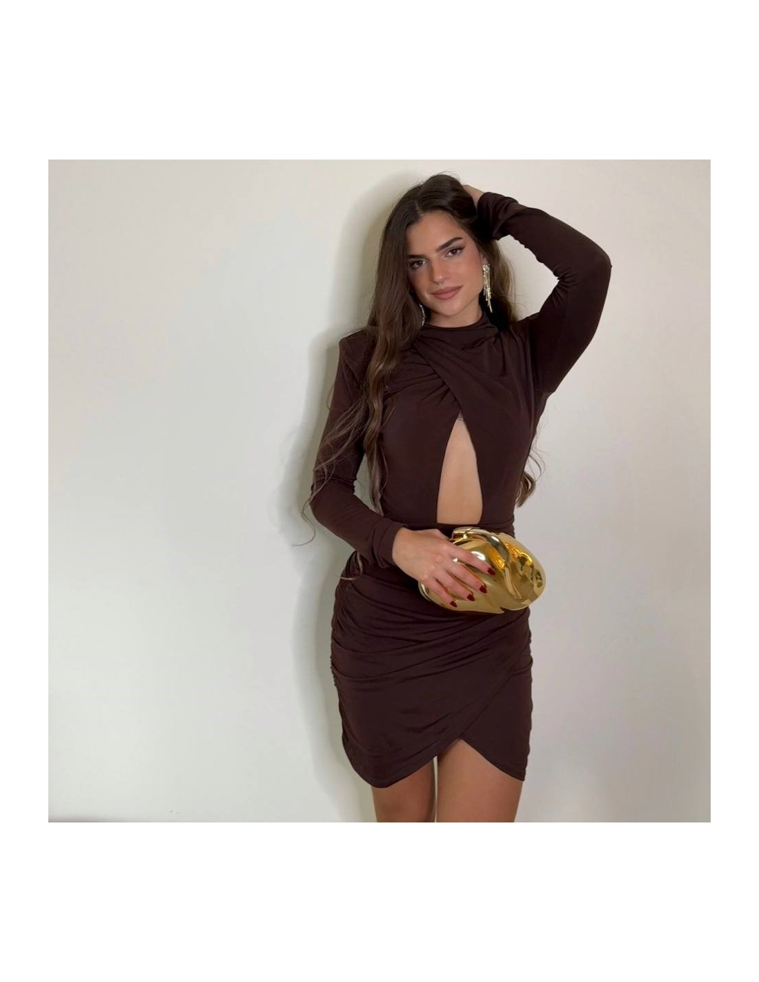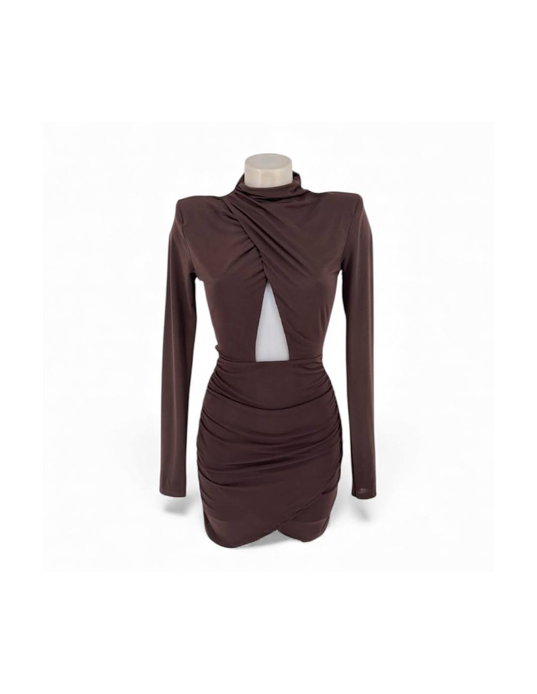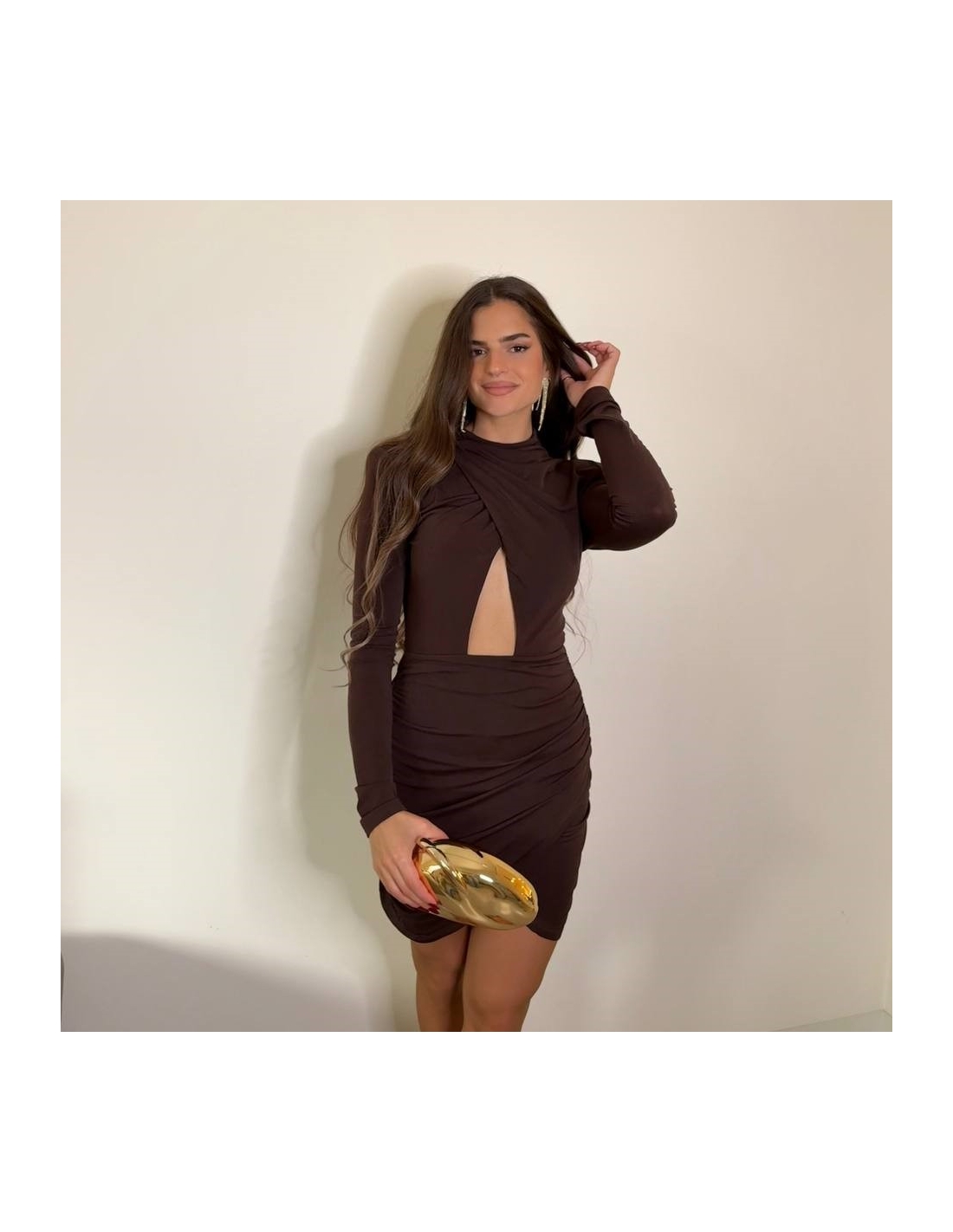 Vestido corto en tono choco. De manga larga. Abertura delantera central. Fruncido. Talla única