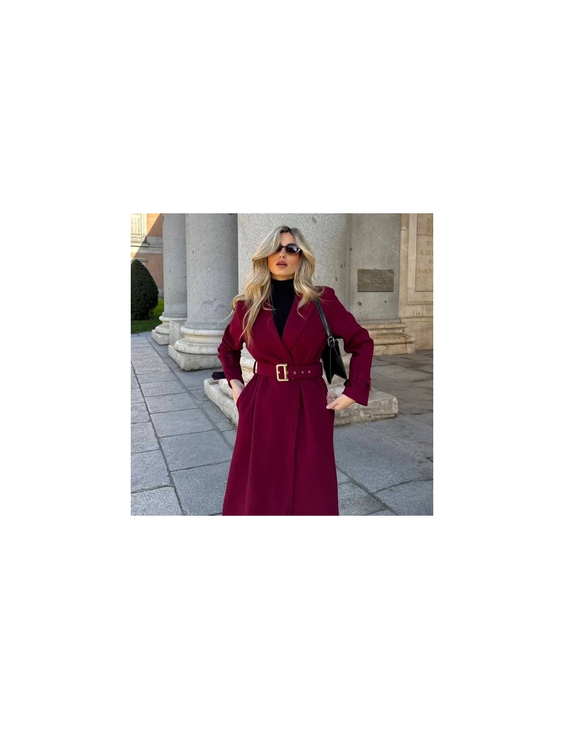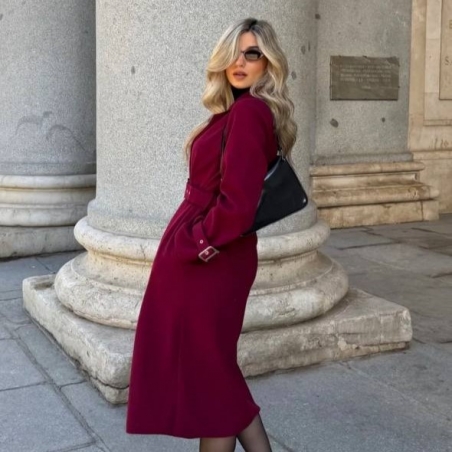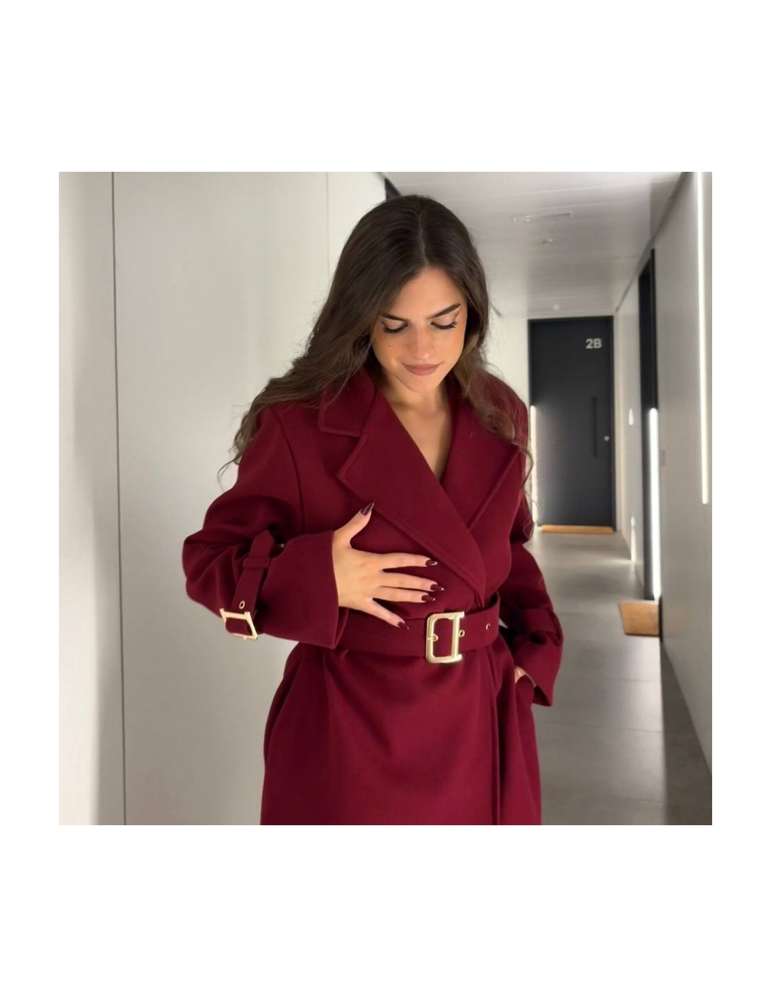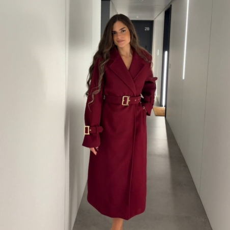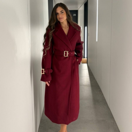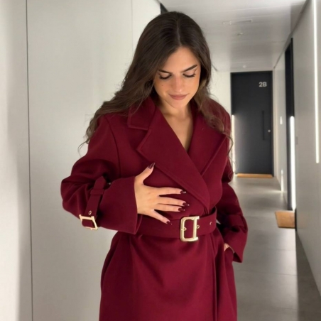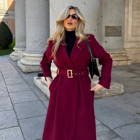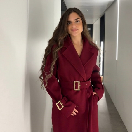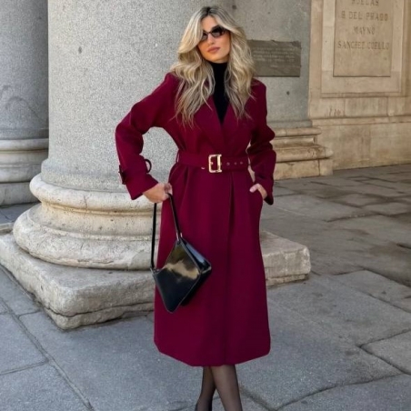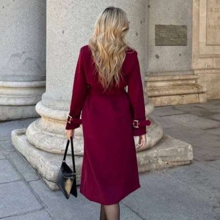 Abrigo de paño largo con cinturón a tono y detalles dorados. Talla única.