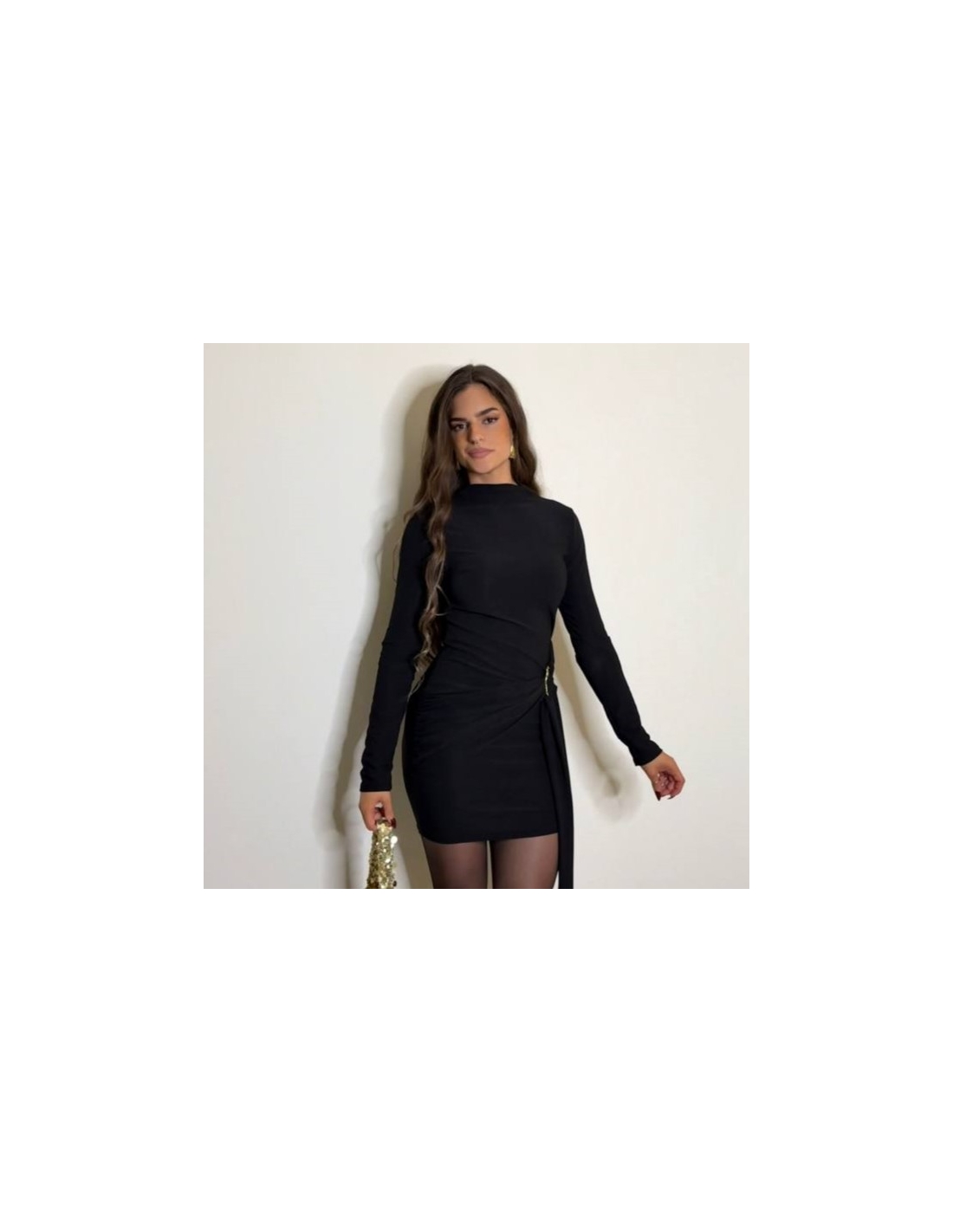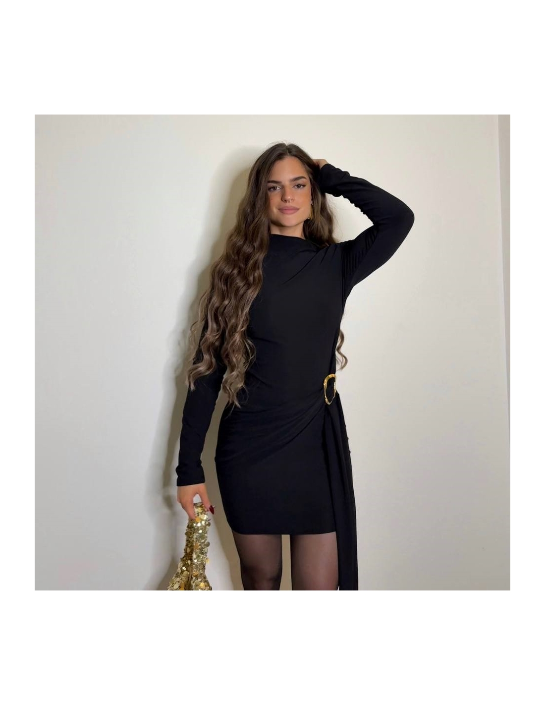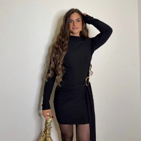 Vestido corto de manga larga en tono negro. Accesorio en lateral con lazada a tono. Elástico. Talla única